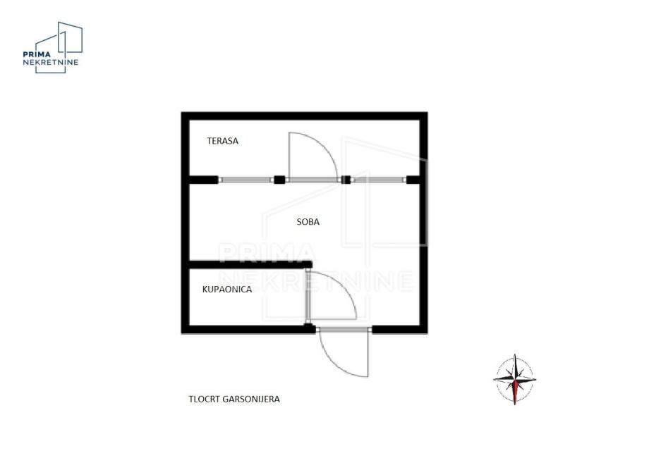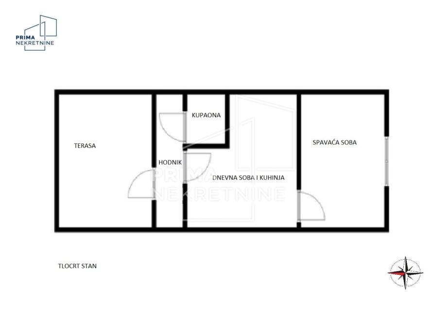 Stan se sastoji od spavaće sobe, dnevne sobe povezane s kuhinjom i kupaonice te terase.