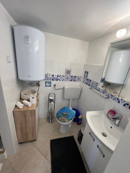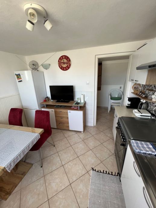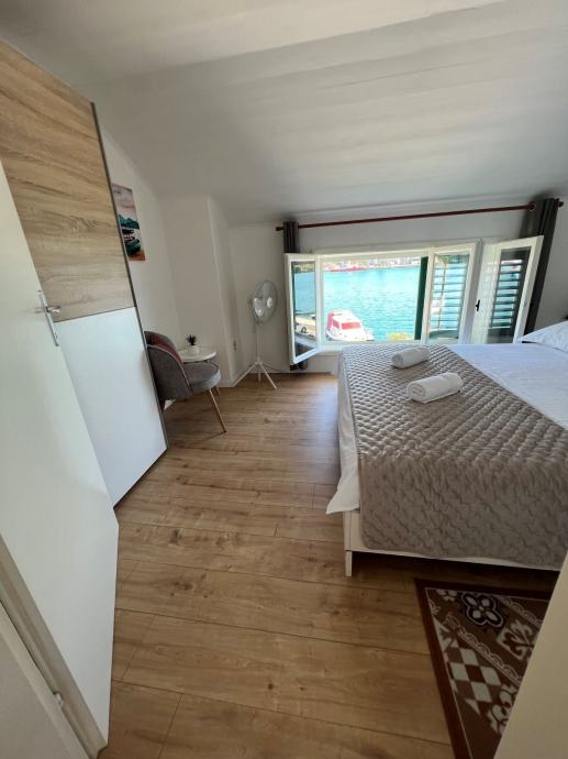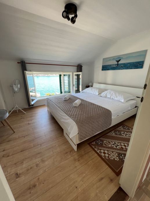 Kuća ima ukupno 155m2, raspoređenih na 3 etaže. Na etaži prizemlja nalaze se 2 kupaonice, ostava, hodnik, kuhinja i blagavaonica. Etaža prvog kata ima lijepi pogled na more i iz dnevnog boravka i iz spavaće sobe. Na etaži potkrovlja nalazi se druga spavaća soba, i treća prostorija od 20m2 kojoj je potrebna adaptacija.