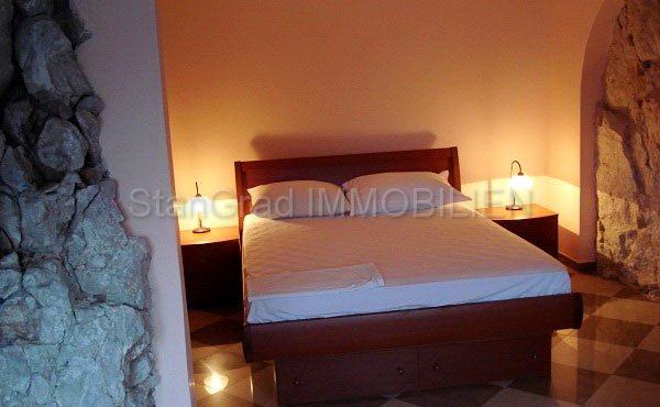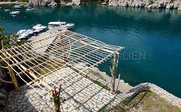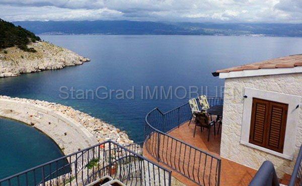 Otok Krk, Vrbnik. Agencija Stan Grad Immobilien u svojoj ponudi ima samostojeću kuću. Adaptirana kamena kuća nalazi se na stijeni iznad mora cca 20m do samog mora. Kuća se sastoji od dnevnog boravka, kuhinje, tri spavaće sobe, tri kupaonice s wc-om i još jednog wc-a. Ispred svake sobe nekretnine nalazi se terasa s fantastičnim pogledom na more i Kvarner. Nekretnina je formirana kaskadno i prati okućnicu unutar koje je predviđen i bazen. Kuća je u potpunosti namještena. Do plaže odmah ispred objekta vode privatne stepenice. Vlasnička dokumentacija je uredna a agencija Stan Grad Immobilien pomoći će Vam oko prijenosa komunalija.