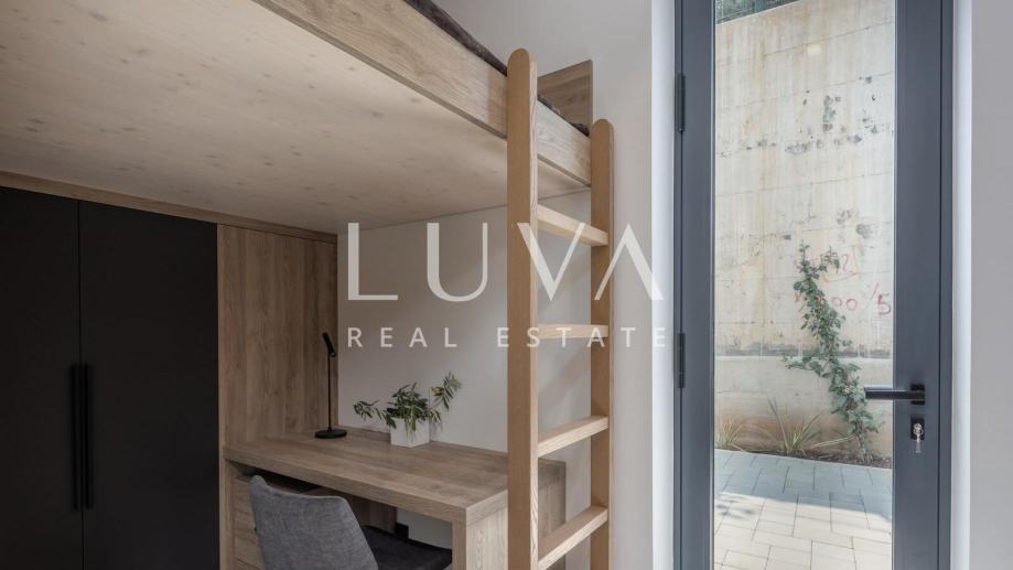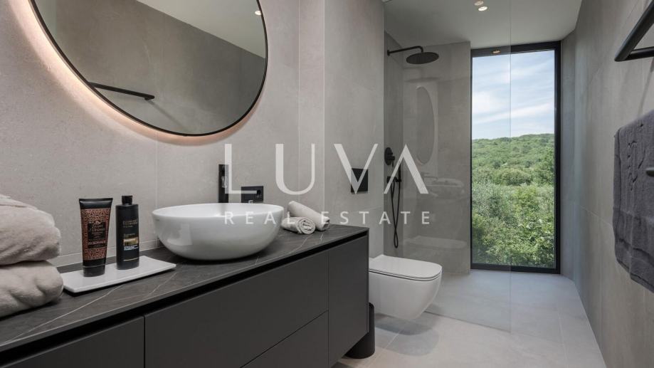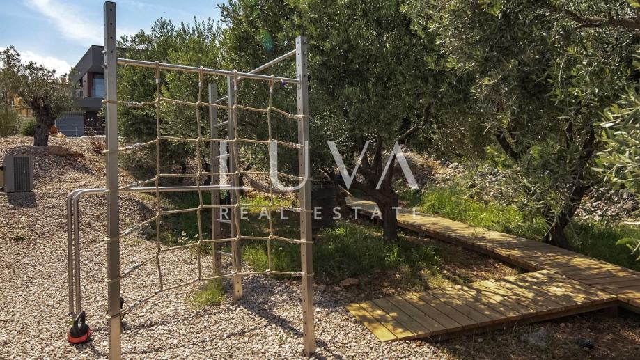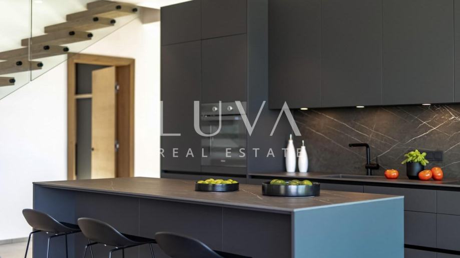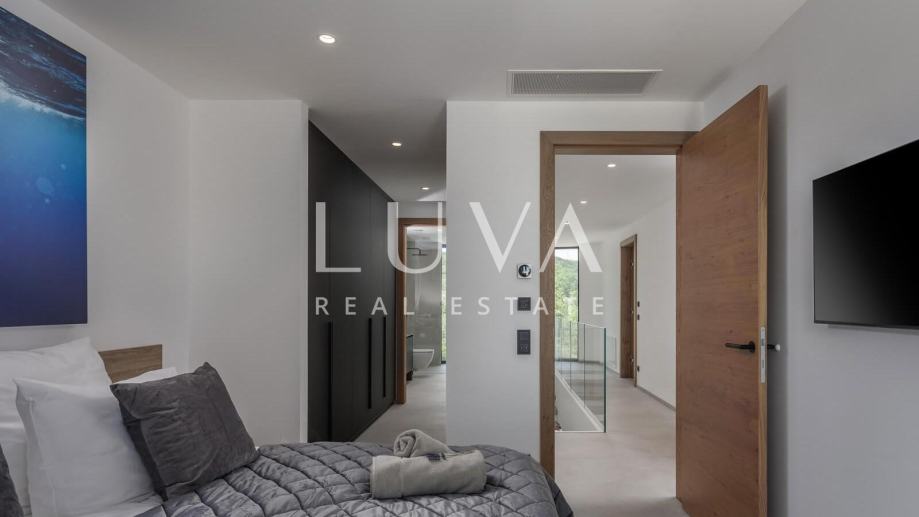Ova suvremeno uređena nekretnina raspolaže s četiri prostrane spavaće sobe i tri elegantne kupaonice, pružajući vrhunsku razinu komfora za obitelj ili manju grupu. Glavni dnevni prostor povezuje kuhinju, blagovaonicu i boravak u prozračnu cjelinu iz koje se izlazi na terasu s pogledom na more. Na raspolaganju su vanjski bazen, jacuzzi i sauna, što čini ovu vilu savršenim spojem privatnog wellnessa i luksuznog mediteranskog životnog stila.