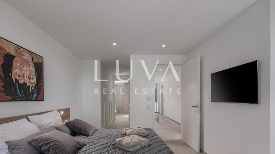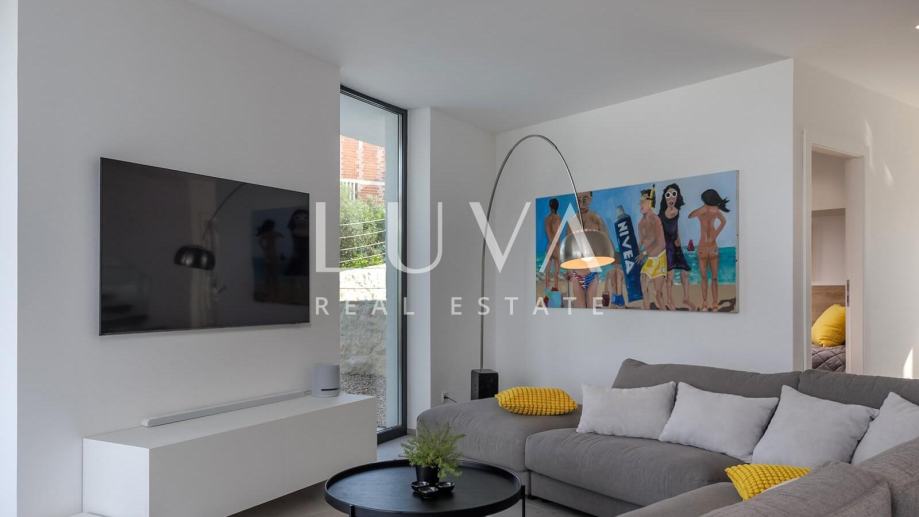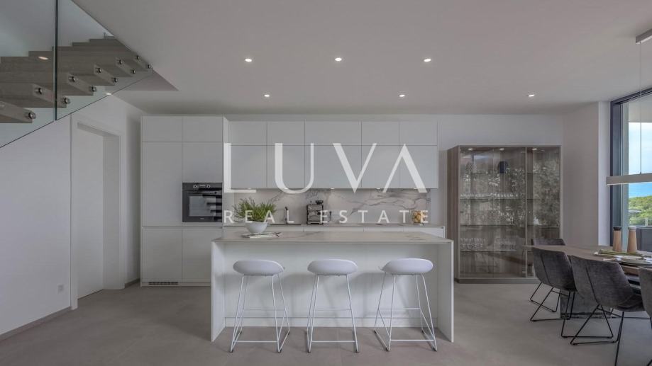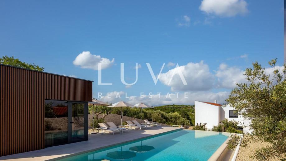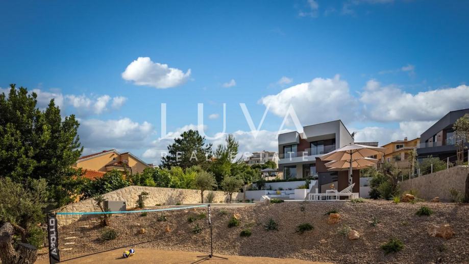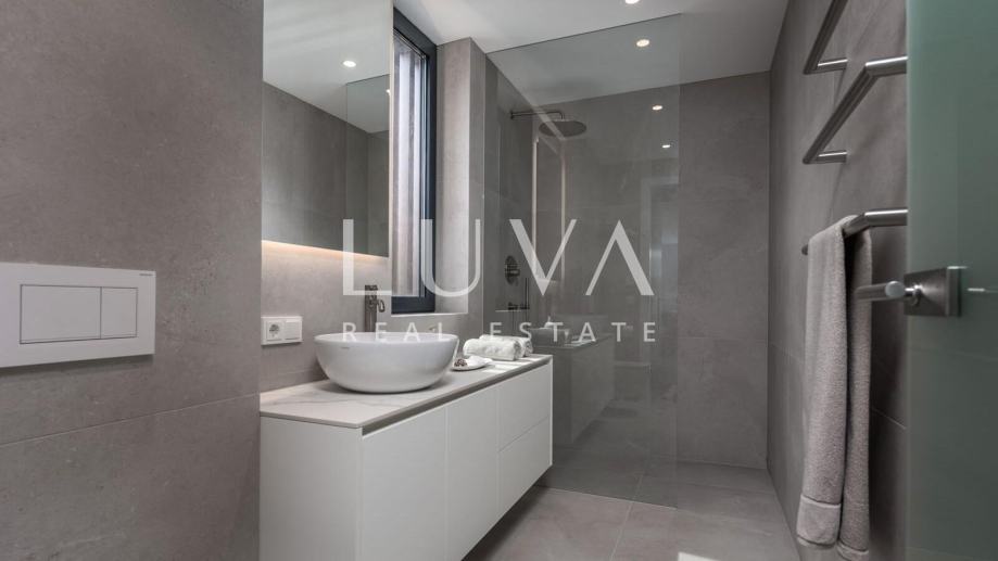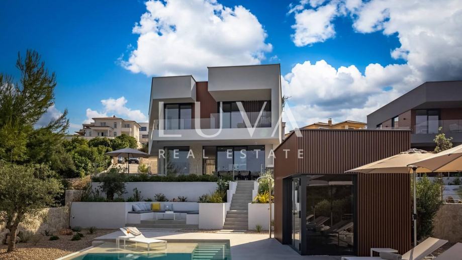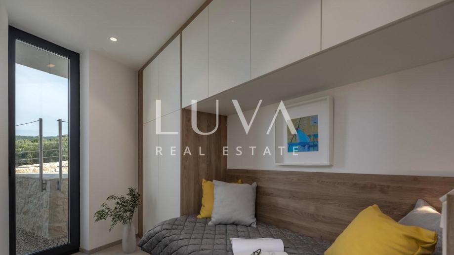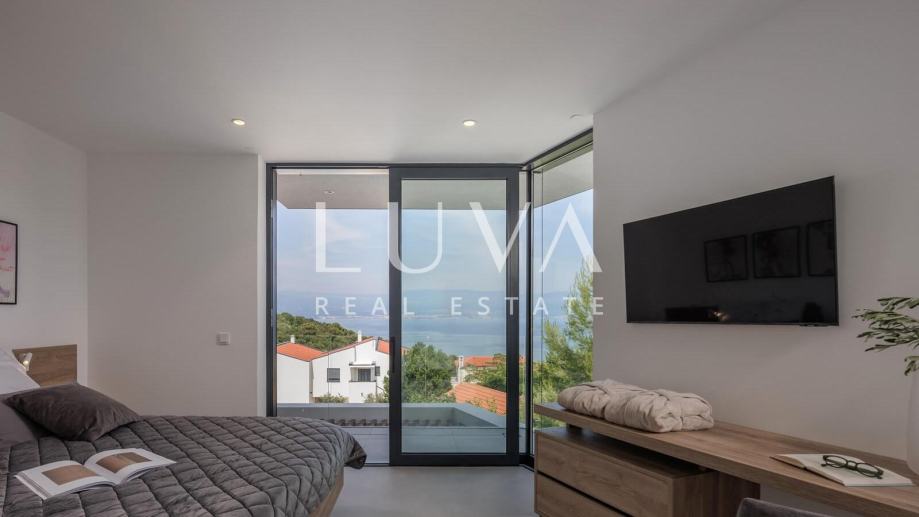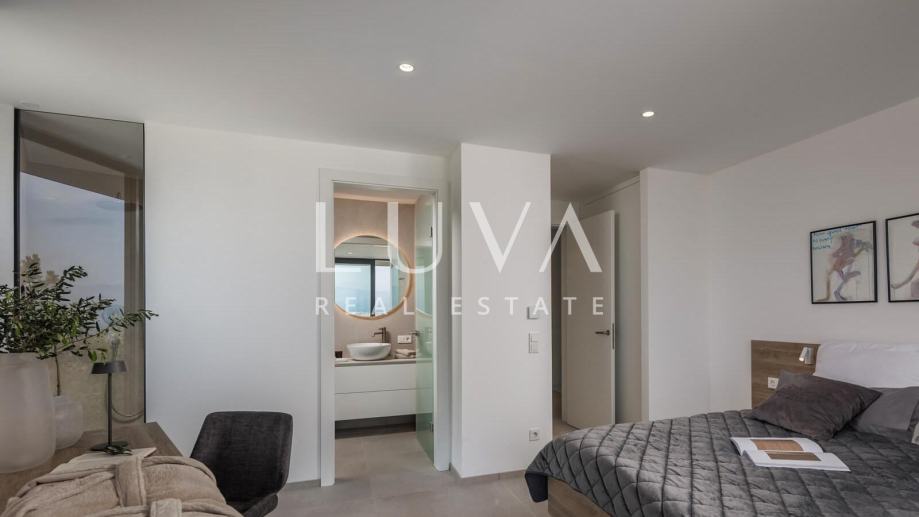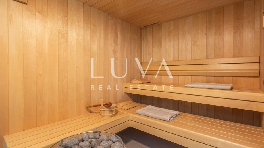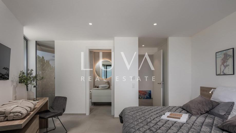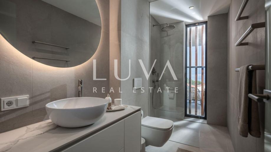 Ova suvremeno uređena nekretnina raspolaže s četiri prostrane spavaće sobe i tri elegantne kupaonice, pružajući vrhunsku razinu komfora za obitelj ili manju grupu. Glavni dnevni prostor povezuje kuhinju, blagovaonicu i boravak u prozračnu cjelinu iz koje se izlazi na terasu s pogledom na more. Na raspolaganju su vanjski bazen, jacuzzi i sauna, što čini ovu vilu savršenim spojem privatnog wellnessa i luksuznog mediteranskog životnog stila.