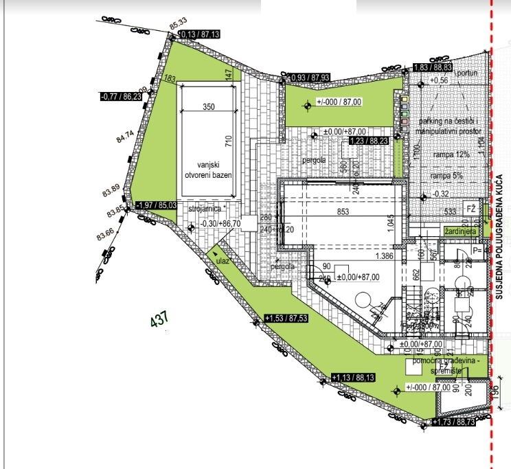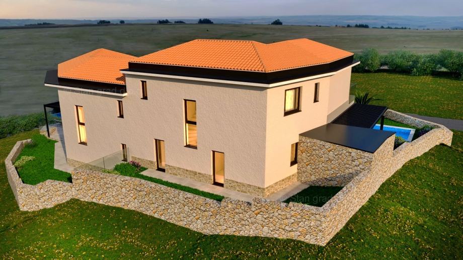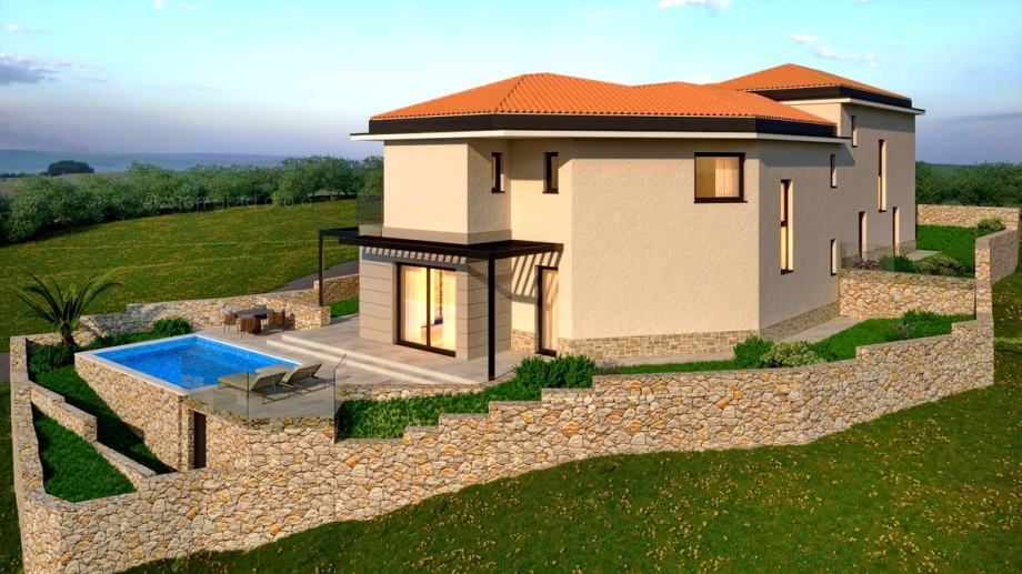 Iz široke ponude nekrenina agencije Stan Grad Immobilien ističe se luksuzna dvojna kuća u regiji otok Krk. Ova prekrasna kuća je na vrlo privlačnoj lokaciji blizu mora i centra turističkog središta Vrbnik. Luksuzna je kuća izvedena na sveukupno 2 etaže. Kuća se proteže na ukupnoj površini 172 m2. U toj su površini obuhvaćeni u prizemlju ulazni hodnik, spremište, tehnička soba, praonica, wc, dnevni boravak i kuhinja s izlazom na terasu. Na katu su 3 sp.s., 3 kup., izlaz na nenatkrivenu terasu i natkriveni balkon. U okviru posjeda je i prelijepo uređena okućnica s bazenom, sunčalištem i pergolom. Na spomenutoj okućnici nekretnine može se komforno parkirati više automobila. Osim toga, bitno je istaknuti da kuća ima fantastičan panoramski pogled na more.Predmetni apartman je u vlasništvu pravne osobe i u sustavu PDV-a. Nekretnina je u početnoj fazi gradnje, planirani završetak radova je proljeće 2024. g. Prodavatelj kuće jamči urednu vlasničku dokumentaciju te brz prijenos vlasništva nekretnine. Agencija Stan Grad Immobilien će vam pružiti sve potrebne usluge prilikom uknjižbe i prijenosa nekretnine.
