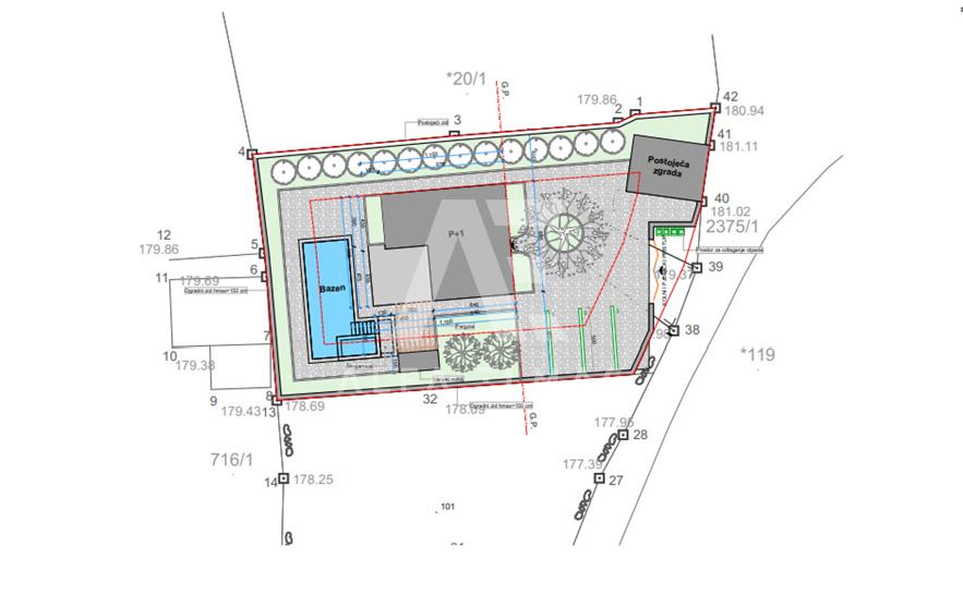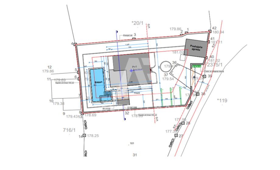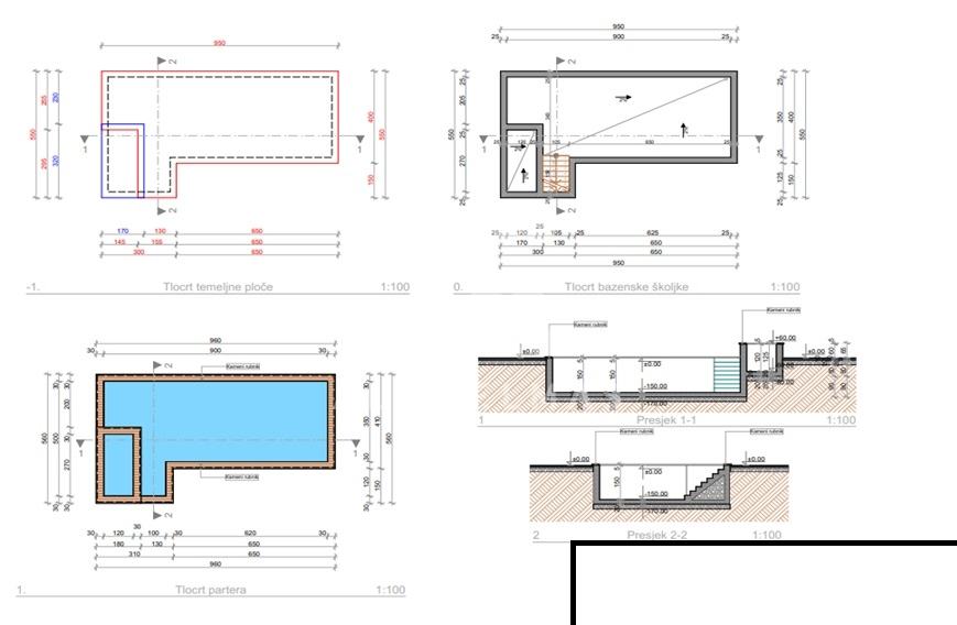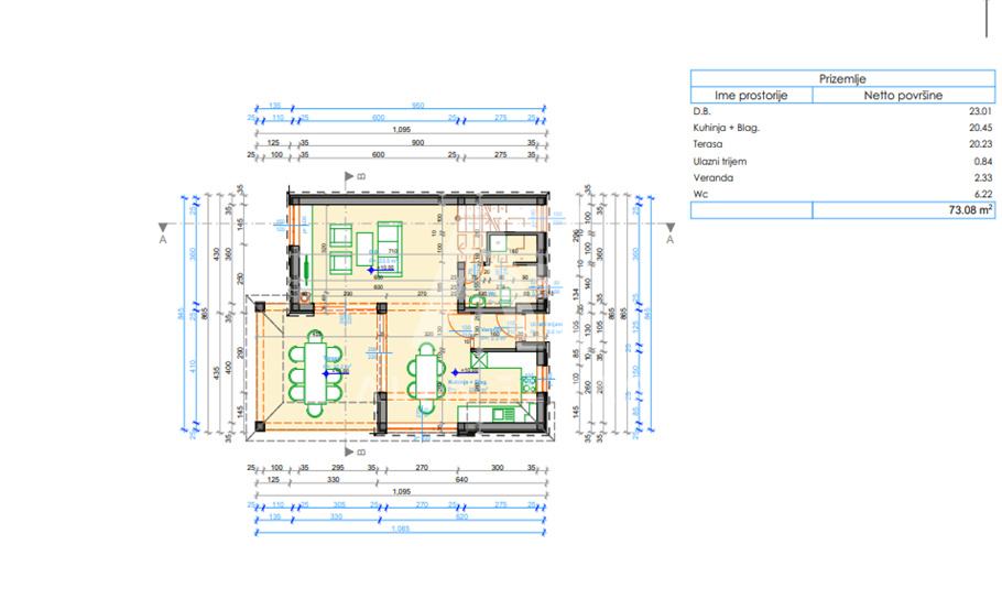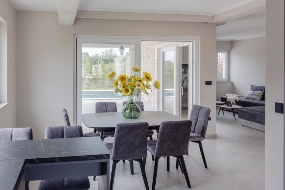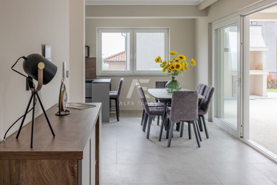 Prizemlje: Prostrano i svijetlo, s otvorenim prostorom za kuhinju, blagovaonicu i dnevni boravak. S prizemlja se izlazi na veliku natkrivenu terasu koja vodi prema bazenu.
