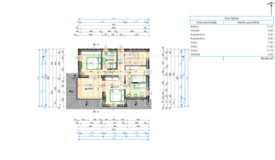 Kat: 3 prozračne spavaće sobe, od kojih jedna ima vlastitu kupaonicu s walk-in tuš kabinom i izlazom na vanjsku natkrivenu terasu. Na katu se također nalazi jedna dodatna kupaonica.