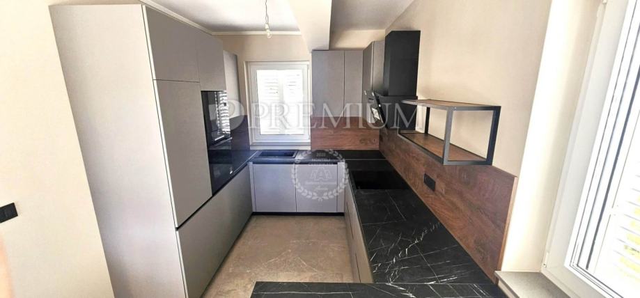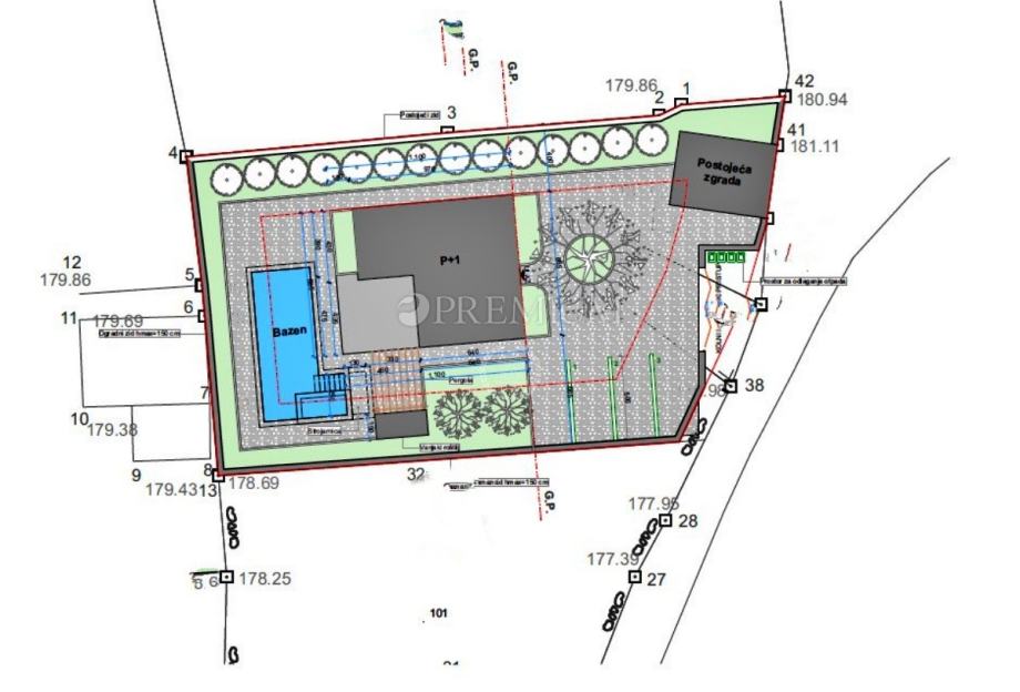 Prekrasnu okućnicu od cca 550 m2 upotpunit će veliki grijani bazen i sunčalište, ljetna kuhinja. Na parceli je također planiran manji pomoćni objekt koji može postati konoba tj. prostor za druženje. Planirana su 2 parkirna mjesta.
