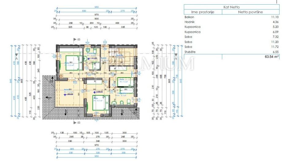 Na katu nalaze se 3 spavaće sobe od kojih 2 imaju zajedničku terasu s djelomičnim pogledom na more i 2 kupaonice.