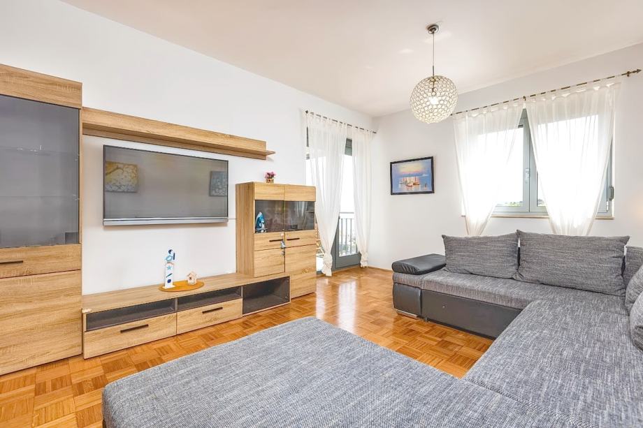 Apartman se nalazi na prvom katu uredno održavane stambene zgrade i prostire se na ukupno 90 kvadratnih metara. Sastoji se od prostranog dnevnog boravka povezanog s kuhinjom i blagovaonicom, tri spavaće sobe, kupaonice, dodatnog WC-a i balkona. Cijeli prostor je pažljivo uređen, potpuno opremljen kvalitetnim namještajem i suvremenim uređajima, te spreman za useljenje bez dodatnih ulaganja.