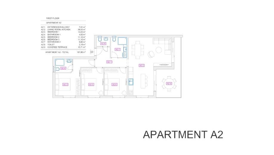 Riječ je o prostranom i vrlo komfornom jednoetažnom apartmanu smještenom na prvom katu moderne zgrade. Ukupna stambena površina iznosi 108 četvornih metara, a prostor je funkcionalno osmišljen i obuhvaća dnevni boravak s kuhinjom i blagovaonicom, tri spavaće sobe, dvije kupaonice, dodatni toalet, spremište te terasu. Vlasniku pripada pravo korištenja svih zajedničkih dijelova i prostora zgrade.