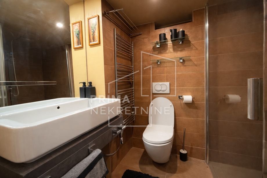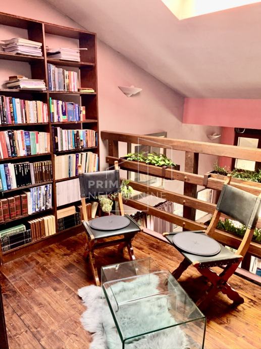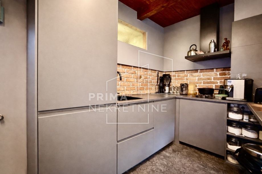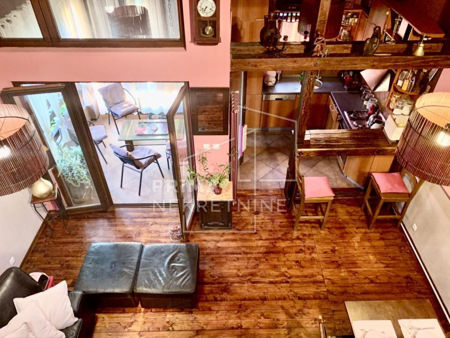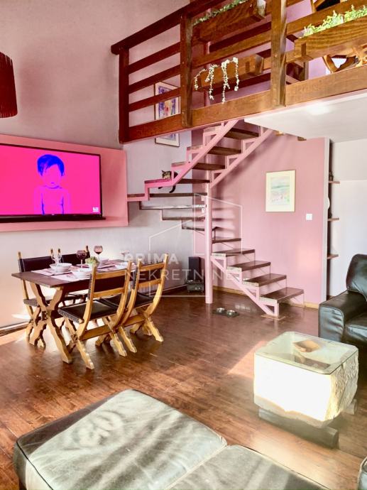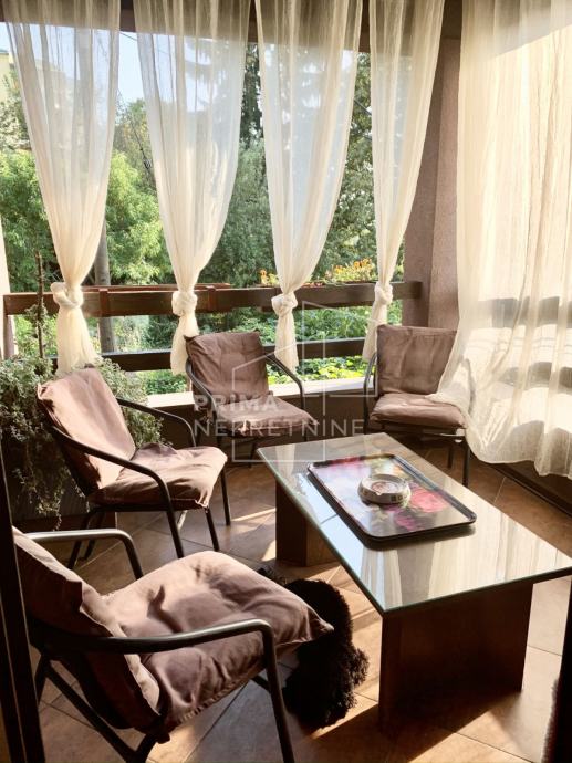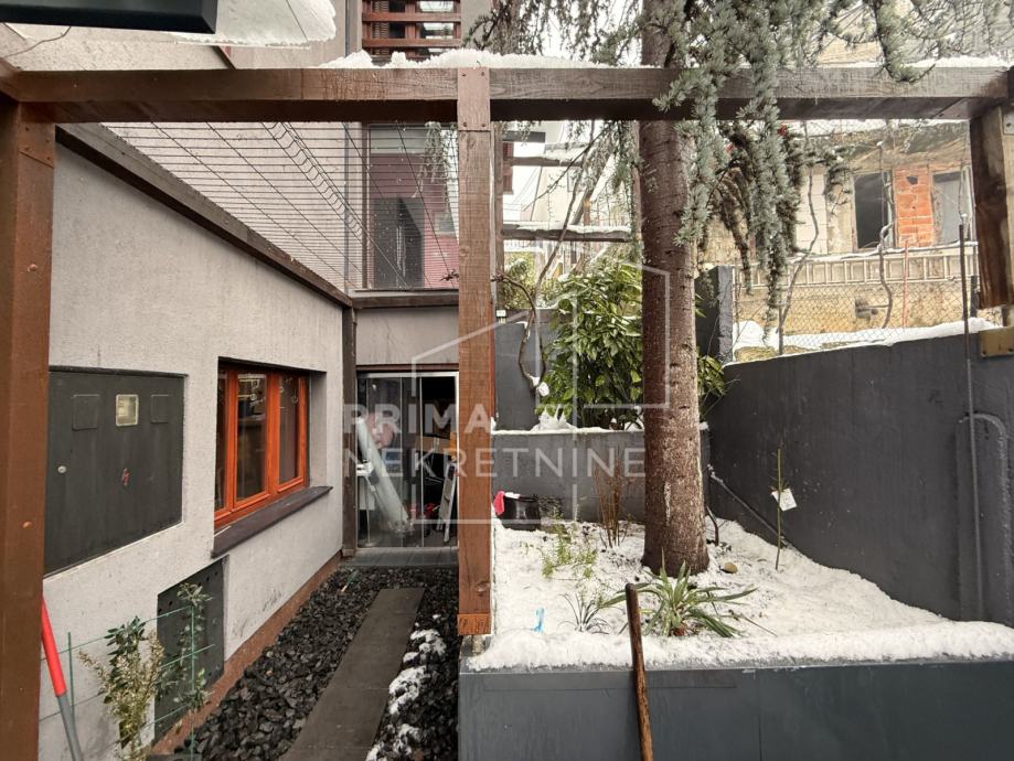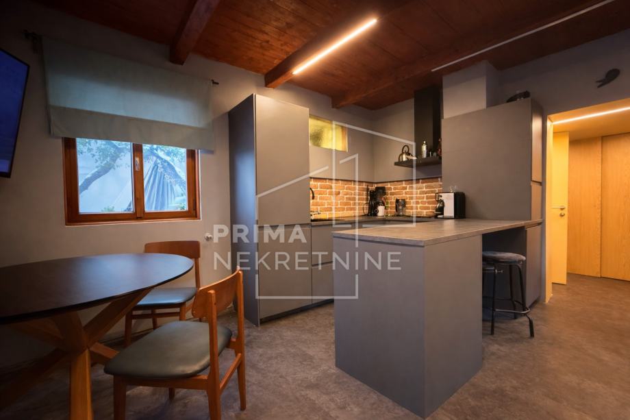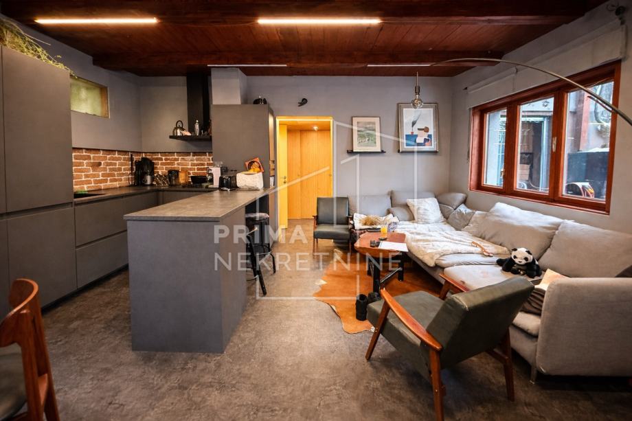 U prizemlju se nalazi stan površine 58 m2 koji se sastoji od dnevnog boravka, dvije spavaće sobe, kuhinje, radne sobe te kupaonice s WC-om, koji je 2021. godine kompletno renoviran. Iz dnevnog boravka omogućen je izlaz na terasu u razini vrta, pružajući ugodan prostor za opuštanje i boravak na otvorenom.