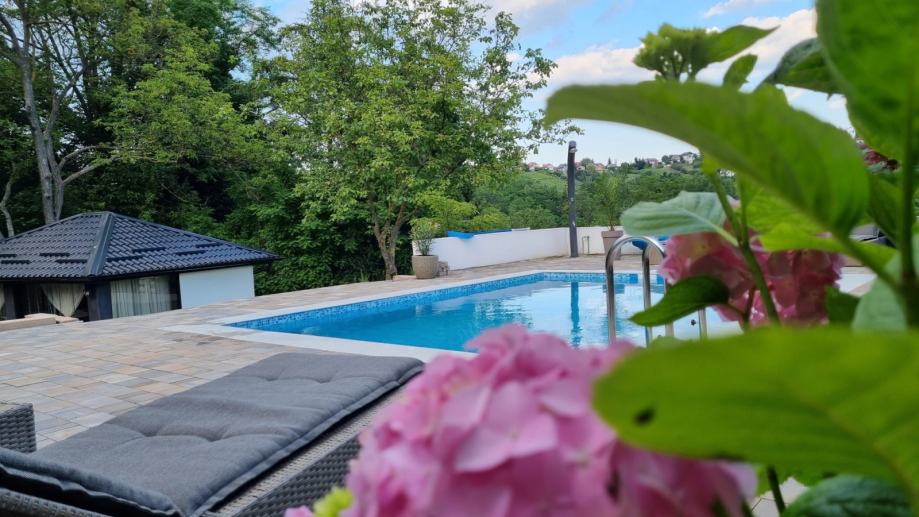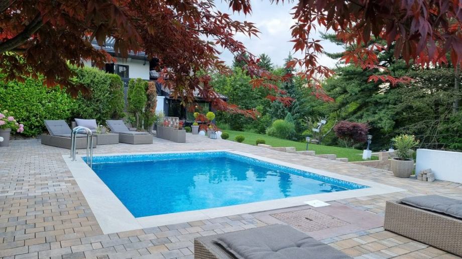 Popločani dio dvorišta s pogledom na bazen. U okviru kuće su roštilj i terasa za druženje.