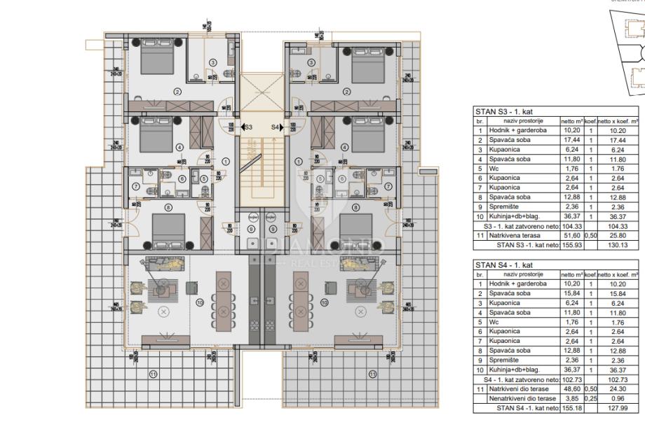 Stan se sastoji od tri prostrane spavaće sobe, od kojih dvije imaju vlastitu modernu kupaonicu. Tu su i dodatni WC, hodnik te prostrana garderoba koja pruža obilje prostora za odlaganje. Svaka kupaonica i WC opremljeni su modernim sustavom električnog podnog grijanja, osiguravajući ravnomjernu i ugodnu toplinu tijekom cijele godine. Otvoreni koncept dnevnog boravka, blagovaonice i kuhinje nudi idealan prostor za obiteljska okupljanja i društvena događanja, dok natkrivena terasa pruža savršeno mjesto za uživanje u blagim mediteranskim večerima. Dodatno spremište omogućuje dodatnu organizaciju vaših stvari.