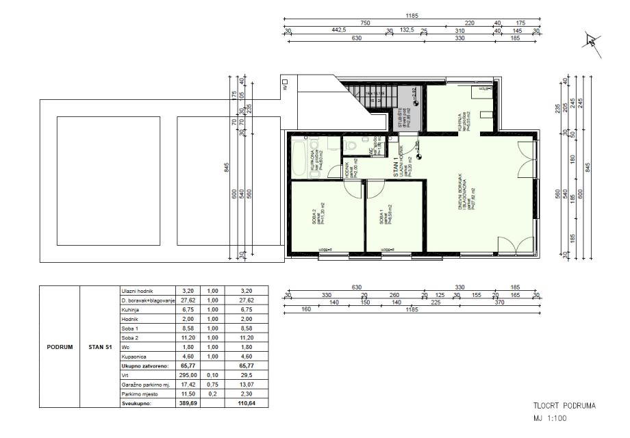 Ukupna tlocrtna kvadratura je 389,69 m2 od čega je zatvoreni prostor stana 65,77 m2.