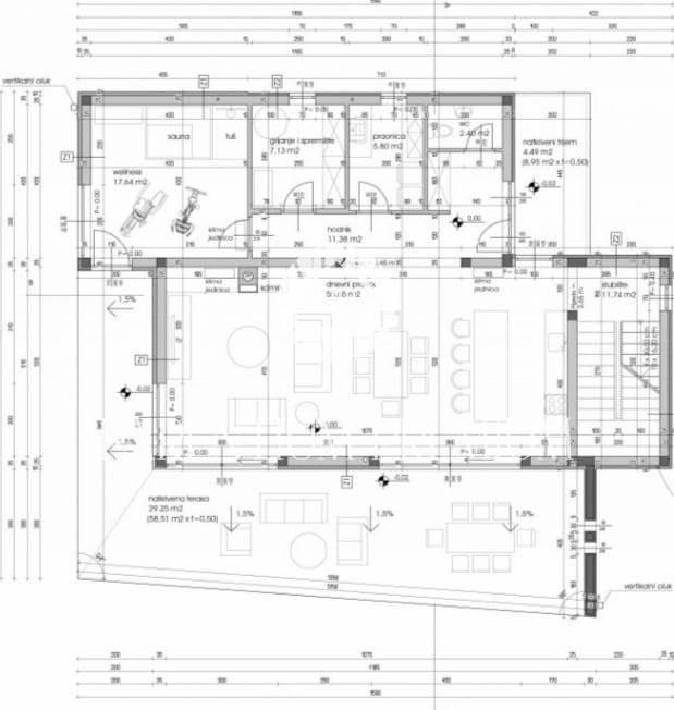Iz dnevnog dijela izlazi se na terasu koja je natkrivena gdje se nalazi bazen sa pogledom na zelenilo.