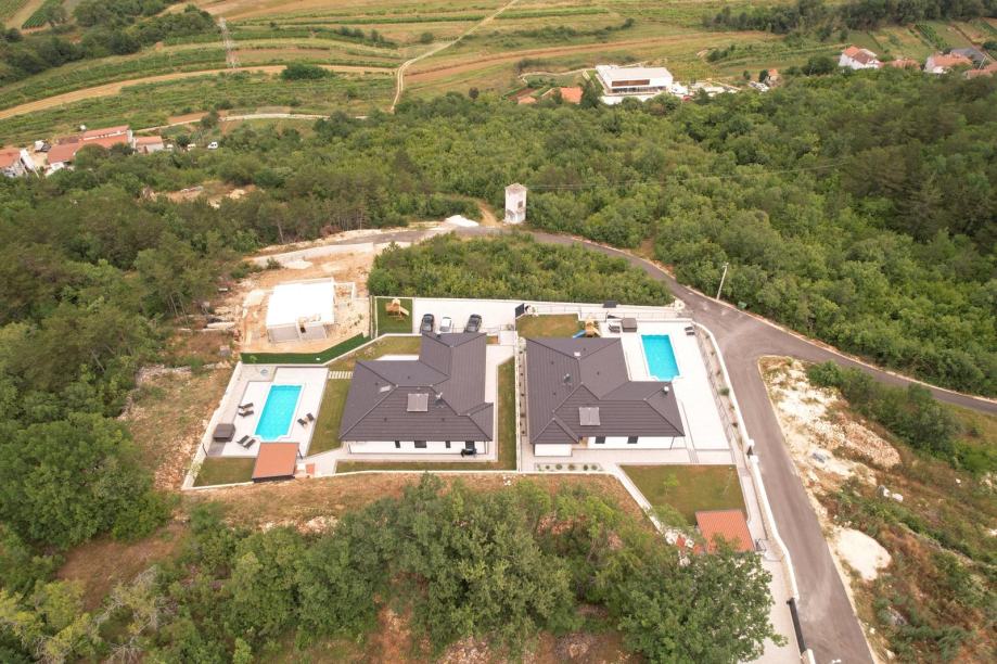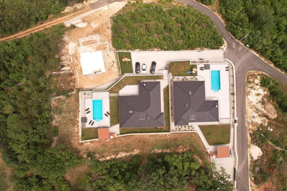 Prodaju se dvije vile u novoizgrađenom naselju u Grubinama pored Imotskog. Svaka vila ima bruto površinu 180m2 (150m2 neto površine), sa 3 spavaće sobe (sa kupaonicama) i dodatnim wc-om, saunom i jacuzzijem. Objekti su rađeni po posljednjim standardima gradnje, od visokokvalitetnih materijala. Uz svaku vilu nalazi se bazen površine 33m2 sa slanom vodom. Oba objekta imaju podno grijanje, klima-sustav te električne rolete. Bazen i podno grijanje svakog objekta spojeni su na dizalicu topline. Kuće imaju prekrasan pogled na Imotsku krajinu, grad Imotski, jezera i Hercegovinu te se nalaze u novoizgrađenom naselju sa kompletnom infrastrukturom (šetnica, rasvjeta). Svaka vila ima pripadajuću prostranu okućnicu od cca 1200m2 uključujući i parking za više auta. Za obje vile vrijedi da je prvo useljenje. Udaljenost od Makarske rivijere je 25 km. S obzirom na odličnu lokaciju, oba objekta su vrhunska investicija, nalaze se u novoizgrađenom elitnom turističkom naselju te je povrat investicije od turističkog najma moguć unutar deset godina. Cijena na upit ili po poslanoj ponudi kupca. Vlasnik je pravna osoba te kupac ne plaća porez na promet nekretnina.