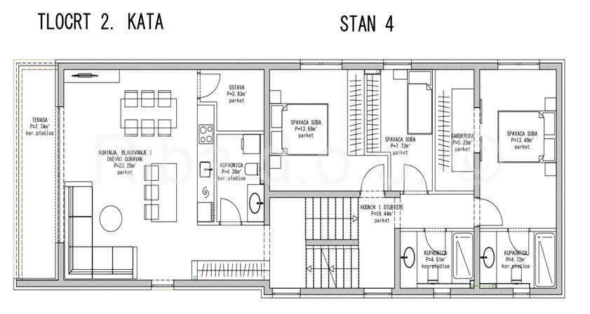 Stan u na drugom katu, orijentiran prema jugu, sastoji se od prostranog dnevnog boravka s kuhinjom i blagovaonicom ukupne površine 33,25 m²,ostave, kupaonice te izlaza na natkrivenu terasu površine 7,74 m². Unutarnjim stepenicama stan se poluetažno nastavlja prema sjevernoj strani, gdje se nalaze tri spavaće sobe, sa dvije kupaonice, kao i garderoba i ostava.