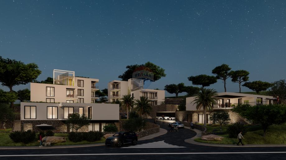Ovaj jedinstveni VIP kompleks vila i stanova namijenjen je kupcima koji traže spoj suvremenog dizajna, privatnosti i prirodne ljepote. Svaka jedinica u kompleksu, uključujući i ovaj stan, ima vlastitu okućnicu i pogled na more i obližnje otoke, a cijeli projekt savršeno je uklopljen u mediteranski pejzaž.