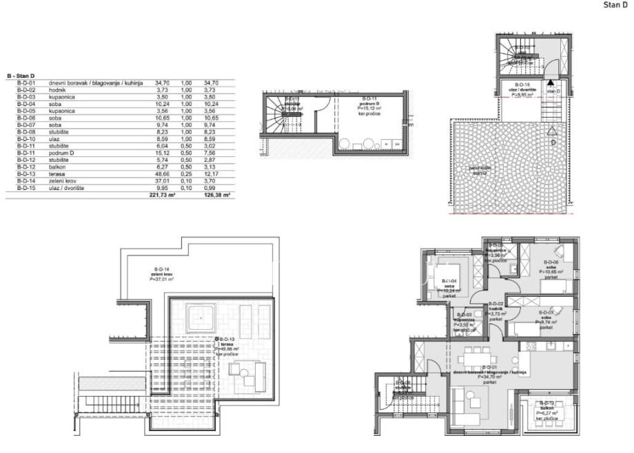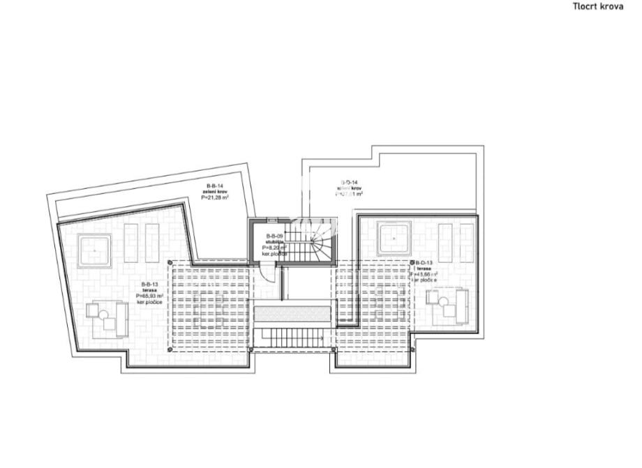 Unutarnjim stubištem dolazimo na krovnu terasu impozantne veličine i prostranosti ukupne površine od 85,67 m2 od kojih 37,01 m2 pripada zelenom pojasu na krovu za uistinu fantastičan ugođaj.