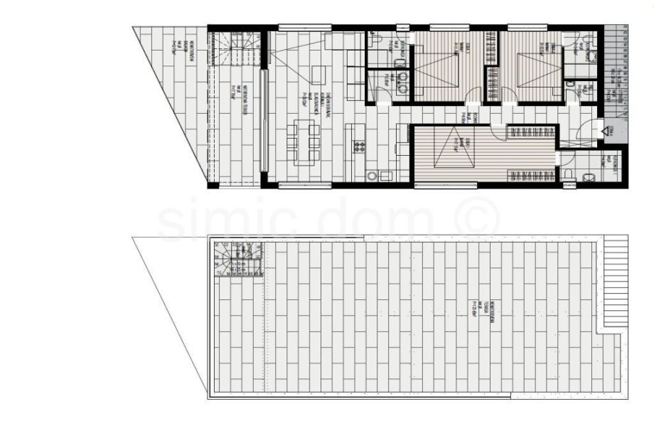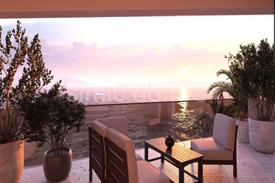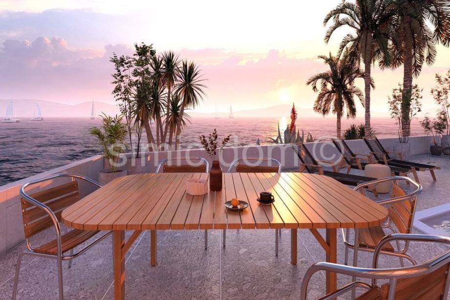 Na prodaju je moderan penthouse apartman u novogradnji u prvom redu na Čiovu, od investitora koji gradi izrazito kvalitetne nekretnine s odličnim i modernim dizajnom. Zgrada se nalazi na najatraktivnijem području i mirnoj lokaciji odmah uz tirkizno plavo more i predivnu plažu. Penthouse apartman nalazi se na drugom katu manje zgrade te ima unutarnju površinu od 104 m2 te još tri terase, dvije u razini apartmana i veliku krovnu terase. Terase zajedno imaju 154 m2 podne površine. S uračunatim koeficijentima apartman ima neto korisnu površinu od 147 m2. Sastoji se od hodnika, tri spavaće sobe - svaka sa vlastitom kupaonicom, a jedna ima i vlastitu garderobu, gostinjskog toaleta, praonice, te kuhinje s blagovaonicom i dnevnog boravka iz kojega se izlazi na terasu s predivnim pogledom na more i dalmatinske otoke. Penthouseu pripada kompletna krovna terasa površine 123,45 m² s koje se pruža pogled na dalmatinske otoke, a koja je idealna za ljetnu kuhinju, hidromasažnu kadu, lounge te ostale sadržaje. Pripadaju mu još i dva vanjska parkirna mjesta. Svaki od apartmana imati će zaseban ulaz u zgradu što pruža privatnost. Svi će apartmani biti vrhunski opremljeni, podno grijanje će biti provedeno kroz cijeli apartman, sve sobe klimatizirane, aluminijska stolarija, vrhunska keramika i sanitarije, a zgrada će imati i video nadzor. U sklopu okućnice zgrade će se nalaziti uređena parkirna mjesta te lijepa mediteranska vegetacija. Ovo je vrhunska nekretnina čija će vrijednost uvijek biti na visokoj razini i u kojoj će vlasnici sigurno uživati. U blizini se nalaze svi sadržaji, a zračna luka je udaljena samo 10 km.