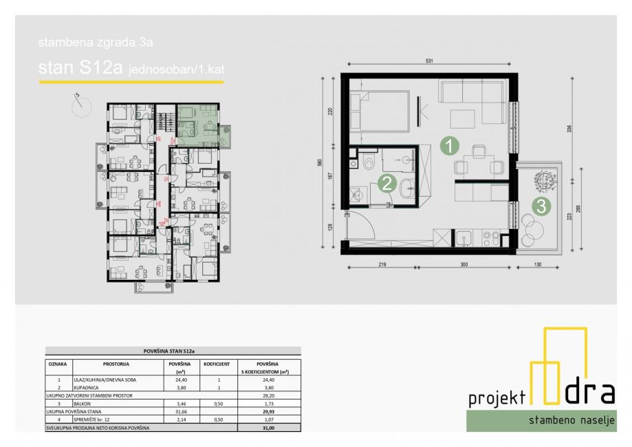 Stan se sastoji od ulaza, dnevnog boravka s kuhinjom, kupaonice i balkona ukupne površine 31,65 m2 (NKP 29,93 m2). Stan se nalazi na 1. katu zgrade.