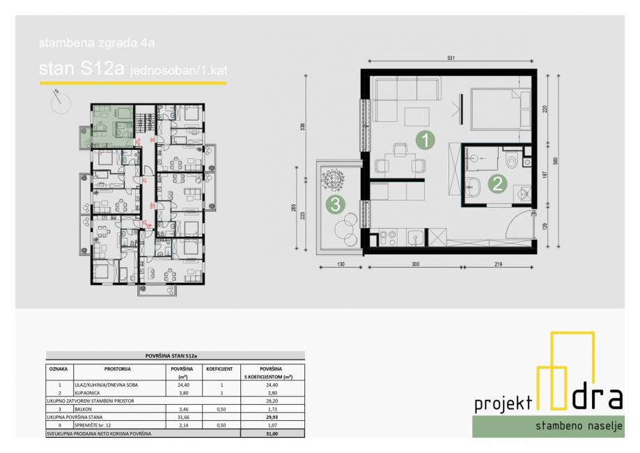 Stan se sastoji od ulaza, dnevnog boravka s kuhinjom, kupaonice i balkona ukupne površine 31,65 m2 (NKP 29,93 m2).