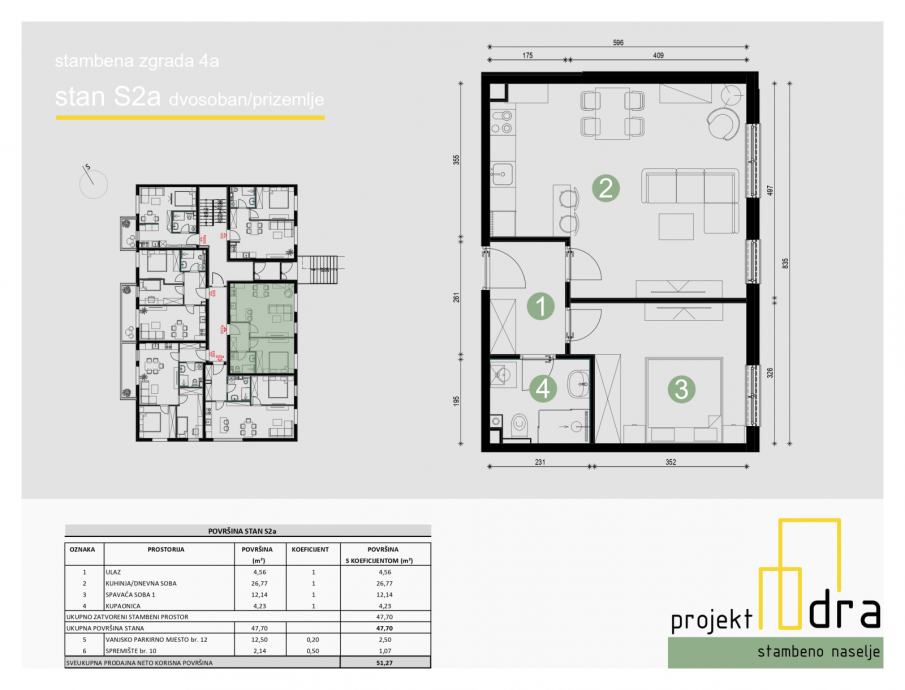 Stan se sastoji od ulaza, dnevnog boravka s kuhinjom jedne spavaće sobe i kupaonice ukupne površine 47,70 m2 (NKP 47,70 m2)