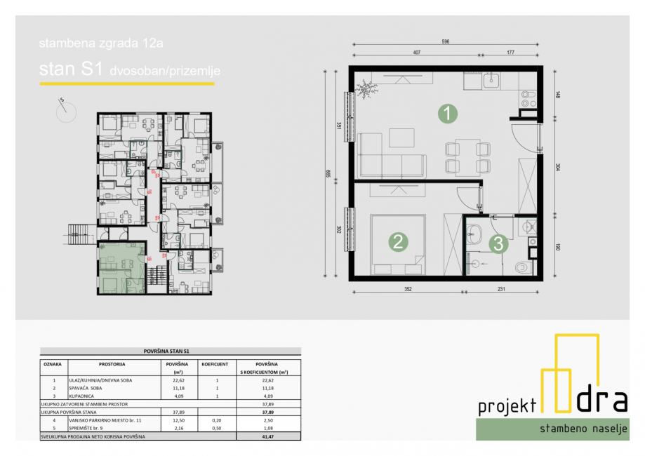 Stan se sastoji od ulaza, dnevnog boravka s kuhinjom, spavaće sobe i kupaonice površine 37,89 m2 (NKP 37,89 m2)