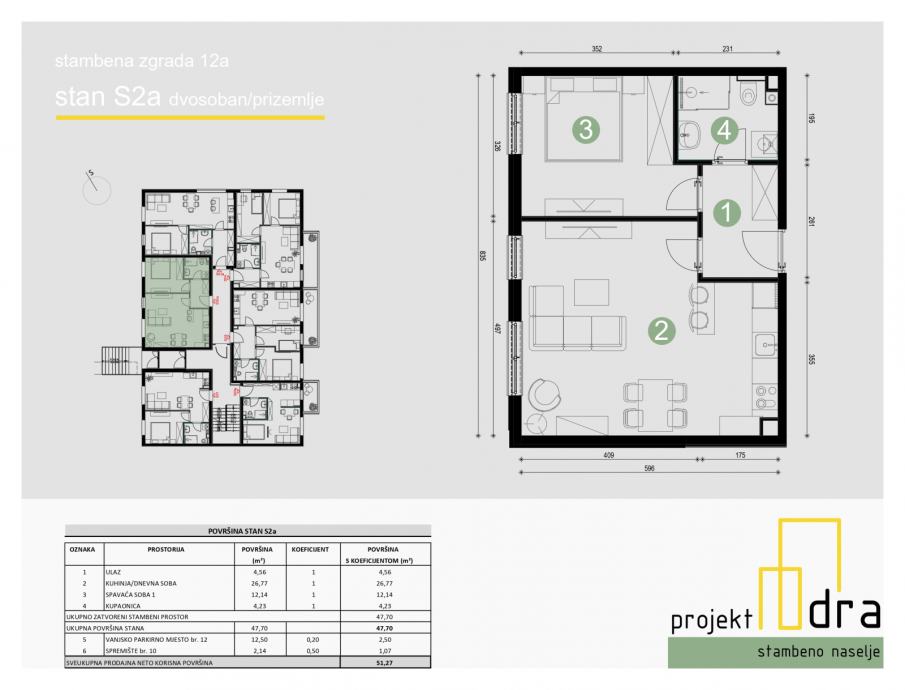 2-SOBAN STAN 47,70 m2 SA VANJSKIM PARKIRNIM MJESTOM I SPREMIŠTEM
