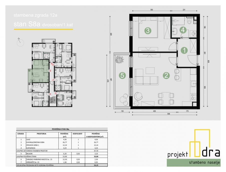 2-SOBAN STAN POVRŠINE 50,80 m2 SA VANJSKIM PARKIRNIM MJESTOM I SPREMIŠTEM