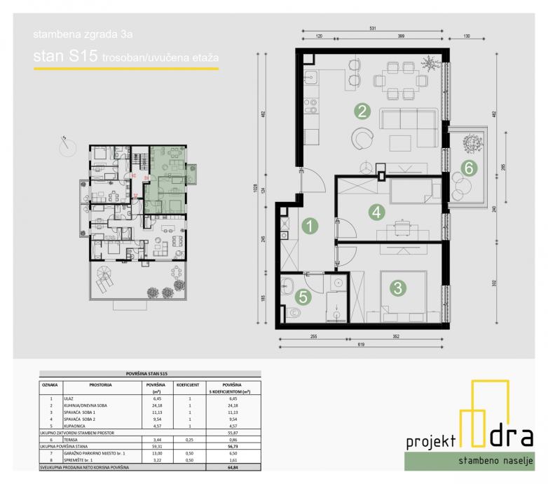 3-SOBAN STAN NKP 56,73 m2 SA GARAŽNIM PARKIRNIM MJESTOM I SPREMIŠTEM