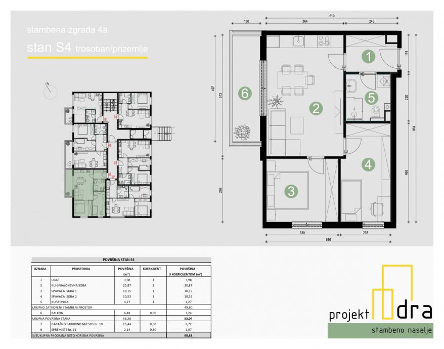 Stan se sastoji od ulaza dnevnog boravka s kuhinjom, 2 spavaće sobe, kupaonice i balkona ukupne površine 56,27 m2 (NKP 53,04 m2). Stan se nalazi u prizemlju zgrade.