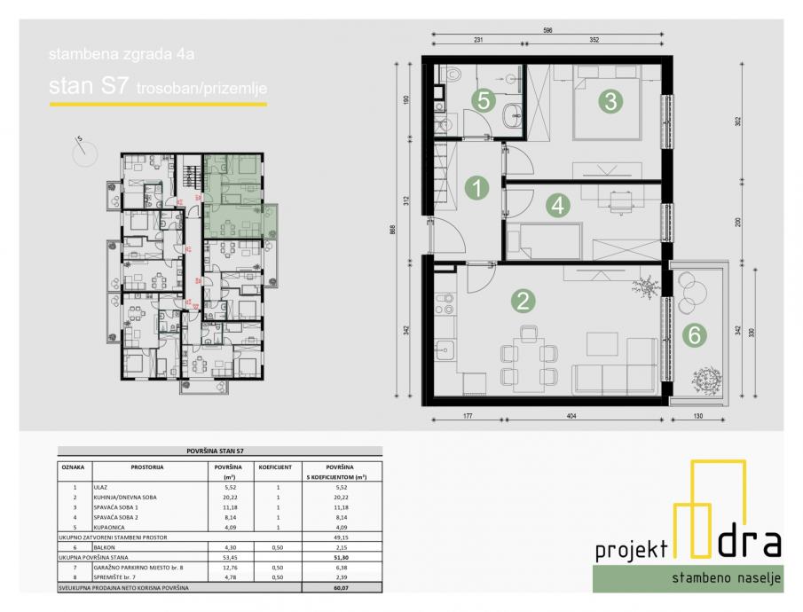 Stan se sastoji od ulaza, dnevnog boravka s kuhinjom, 2 spavaće sobe, kupaonice i balkona ukupne površine 53,45 m2 (NKP 51,30 m2). Stan se nalazi na 1. katu zgrade