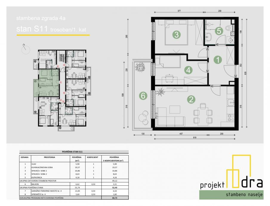 3-SOBAN STAN NKP 52,43 m2 SA GARAŽNIM PARKIRNIM MJESTOM I SPREMIŠTEM