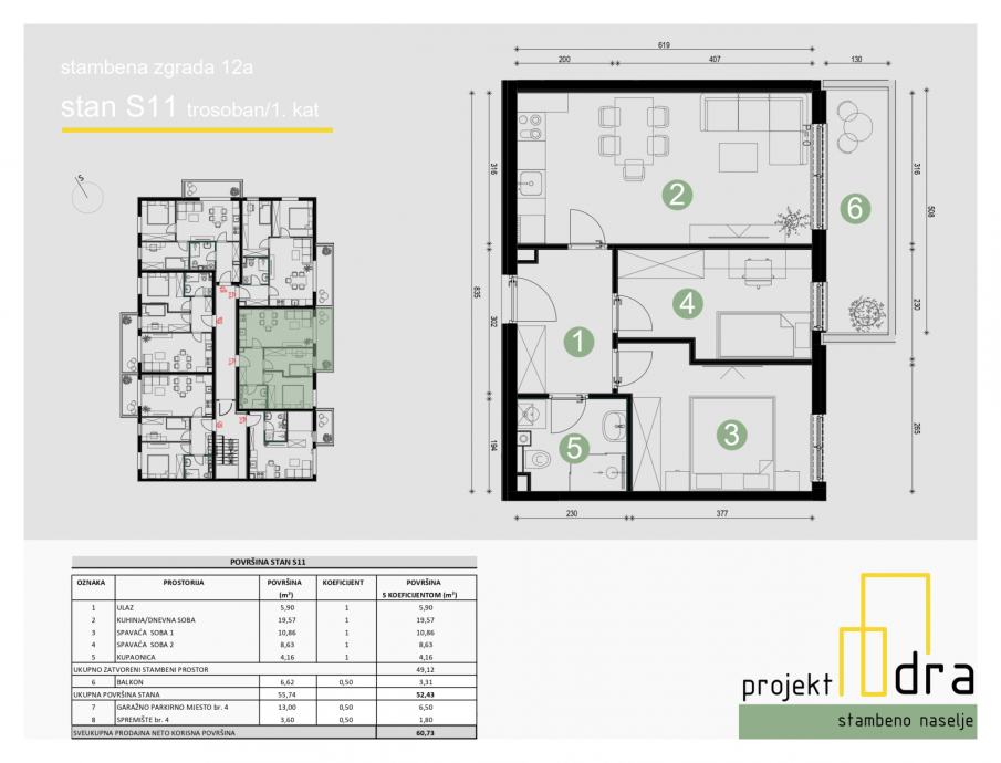 3-SOBAN STAN NKP 52,43 m2 SA GARAŽNIM PARKIRNIM MJESTOM I SPREMIŠTEM