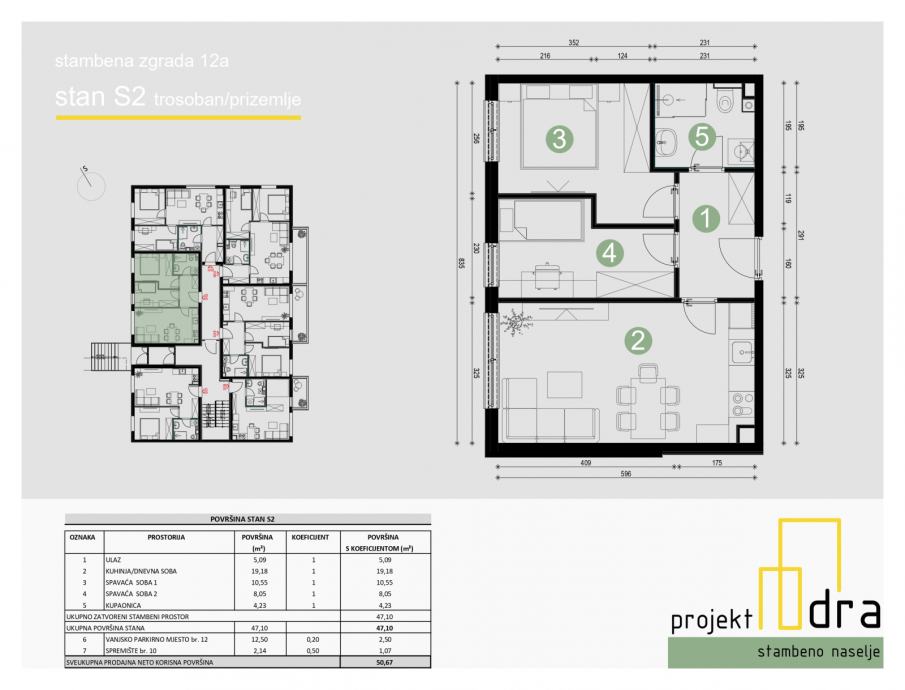 Stan se sastoji od ulaza, dnevnog boravka s kuhinjom, 2 spavaće sobe i kupaonice ukupne površine 47,10 m2 (NKP 47,10 m2)