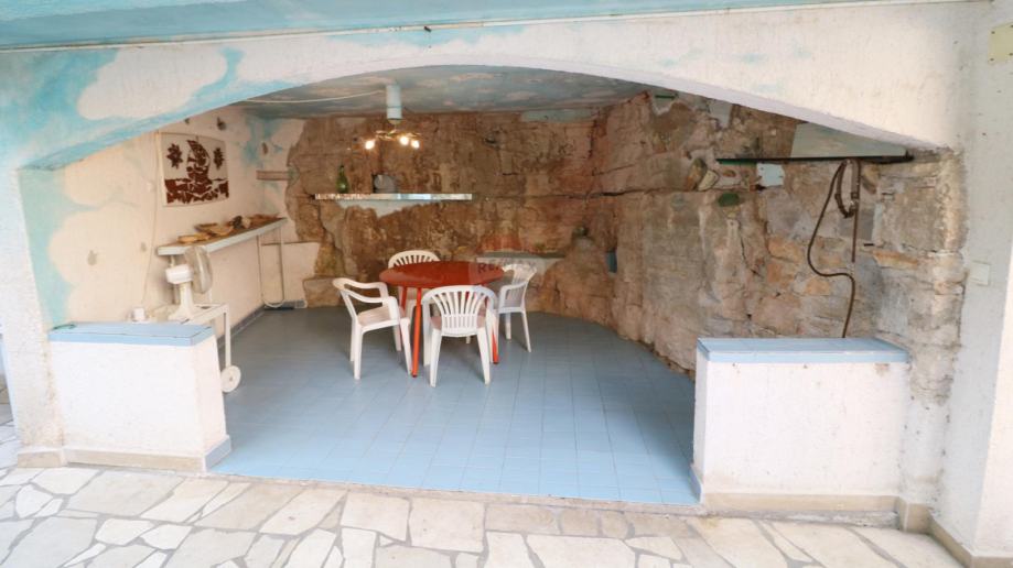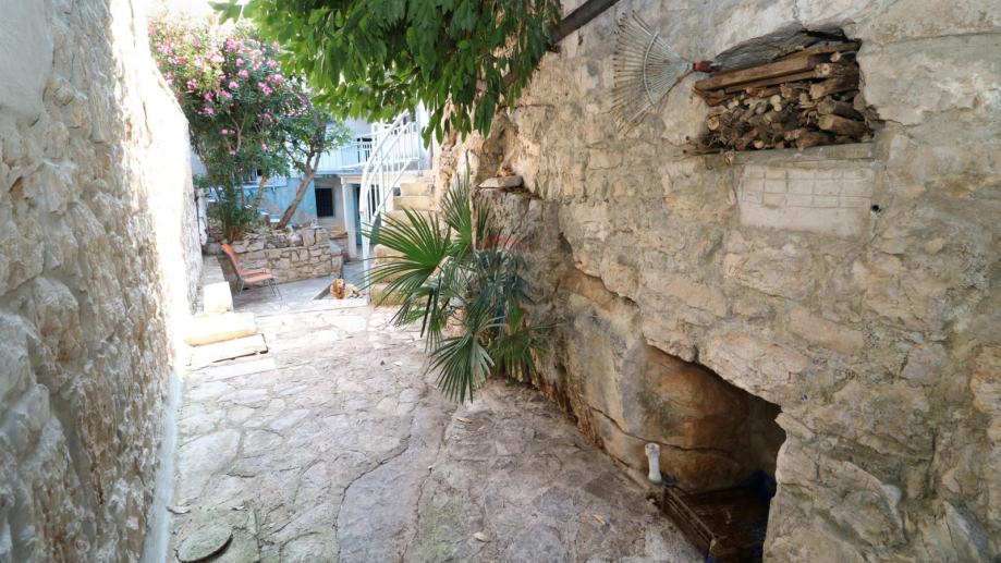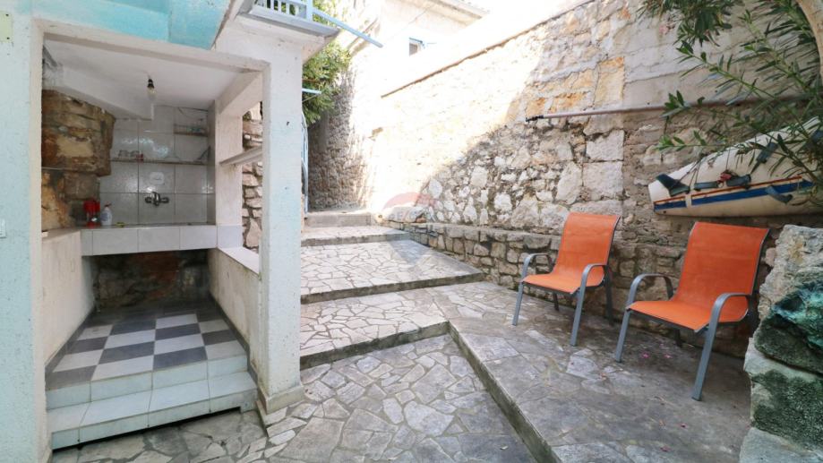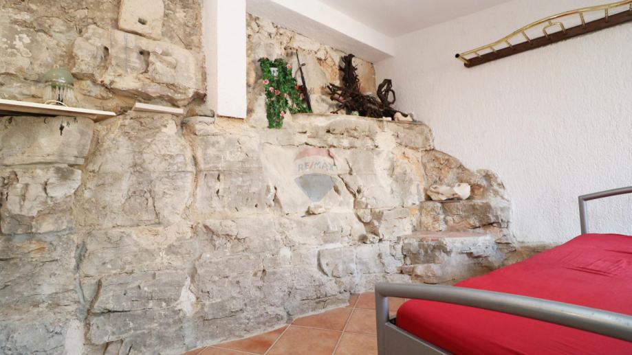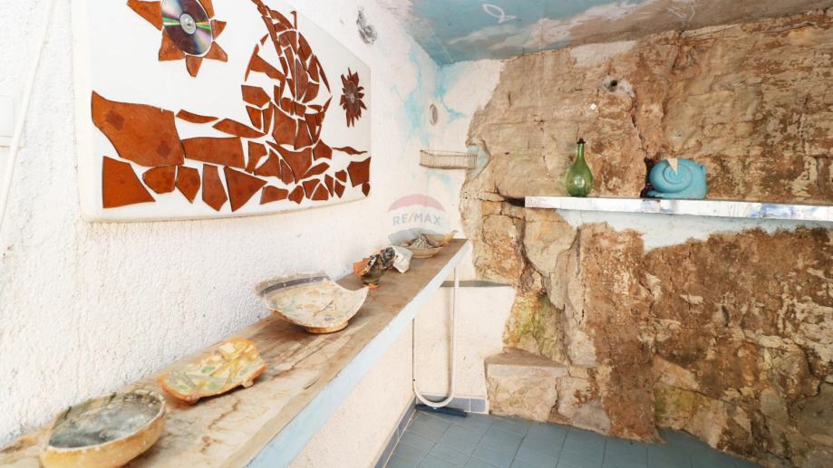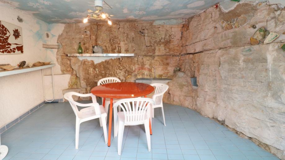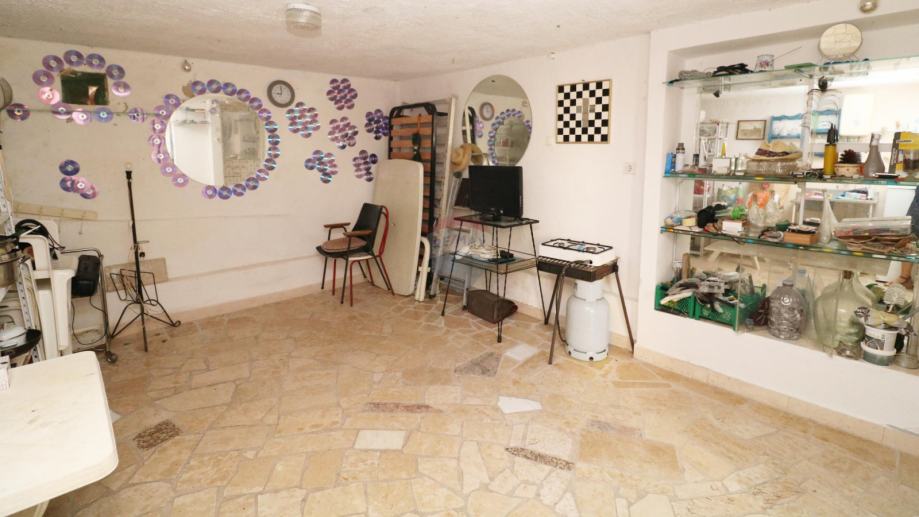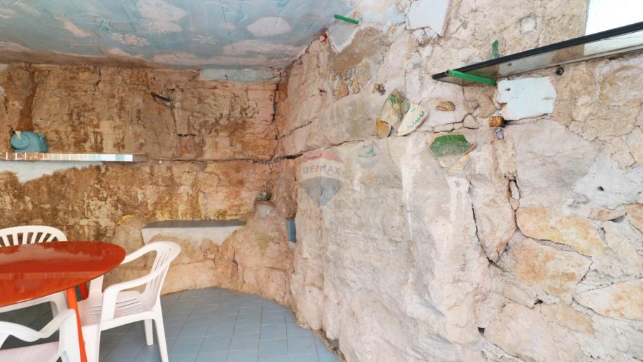 Na prodaju je specifična nekretnina smještena u centru malog, turističkog mjesta. Površine je 83 m2. U prizemlju se nalaze dva prostora, jedan veći koji trenutno služi kao skladište i kuhinja sa kupatilom te otvoreni, natkriveni prostor gdje je stol za druženje i manja, vanjska kuhinjica. Kuća ima dvorište površine 80 m2, potpuno skriveno od pogleda. U natkrivenom djelu dvorišta ističe se velika stijena koja pruža hlad i mir tijekom vrućih ljetnih dana.