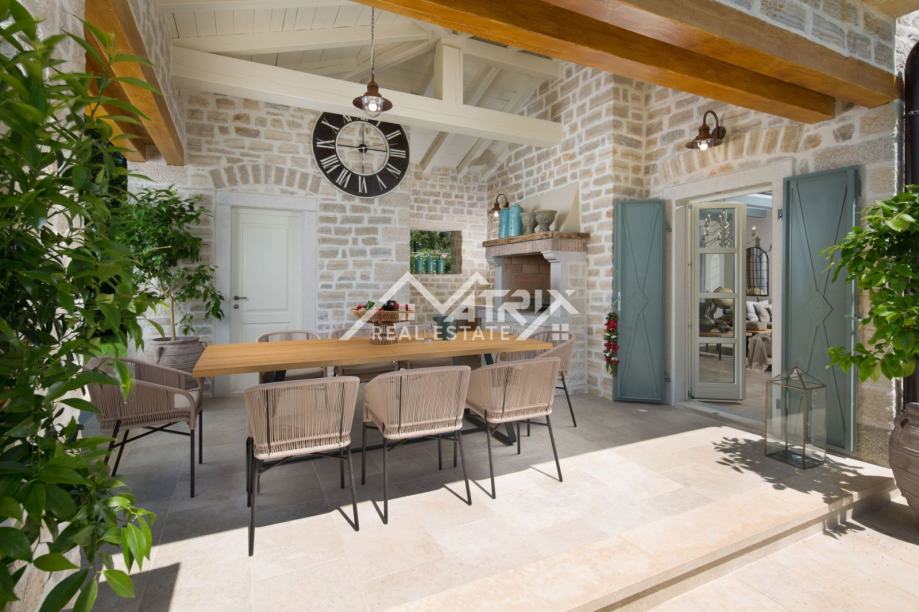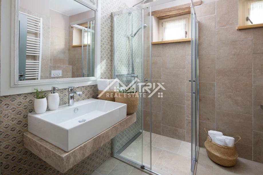 Ukupna stambena površina ove prekrasne vile je 372 m2, raspoređenih na dvije etaže - prizemlje i prvi kat. Centralni dio prizemlja je veliki prostor koji ujedinjuje blagovaonicu s stolom za najmanje 10 osoba, s potpuno opremljenom rustikalnom kuhinjom sa šankom. Također, u prizemlju se nalazi veliki dnevni boravak s kaminom, WC za goste i dvije prostrane spavaće sobe, svaka s vlastitom kupaonicom. Sve prostorije imaju velike staklene stijene koje, uz obilje prirodnog svjetla, omogućuju i direktan izlaz u vrt i na terasu bazena.