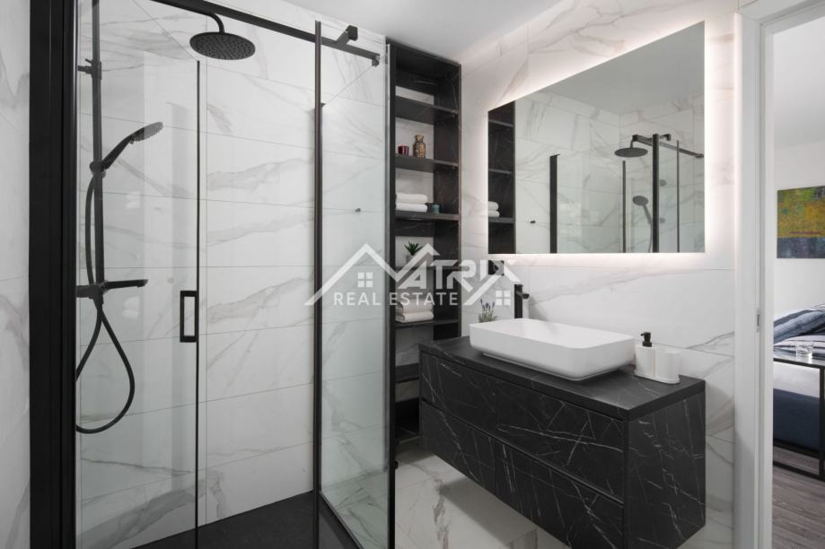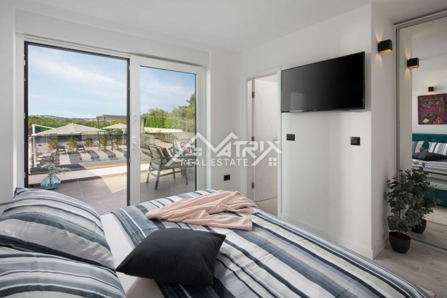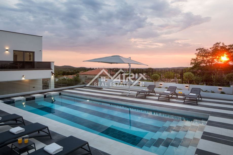 Kuća se prostire na tri etaže: suteren, prizemlje i prvi kat. Centralni dio prizemlja je veliki prostor koji ujedinjuje dnevni boravak s blagovaonicom i kuhinjom, s izlazom na natkrivenu terasu bazena kroz velike staklene stijene, koje pružaju obilje dnevnog svjetla. U prizemlju se također nalazi i jedna spavaća soba sa svojom kupaonicom i wc za goste. Moderne stepenice vode nas na prvi kat gdje se nalaze tri kompletno opremljene spavaće sobe svaka sa svojom kupaonicom i terasom. Iz svake sobe i sa svake terase pruža se prekrasan otvoreni pogled na more i pejzaž. U suterenu se nalazi game-room s biljarskim stolom i PlayStation jedinicom, te kotlovnica i spremište.