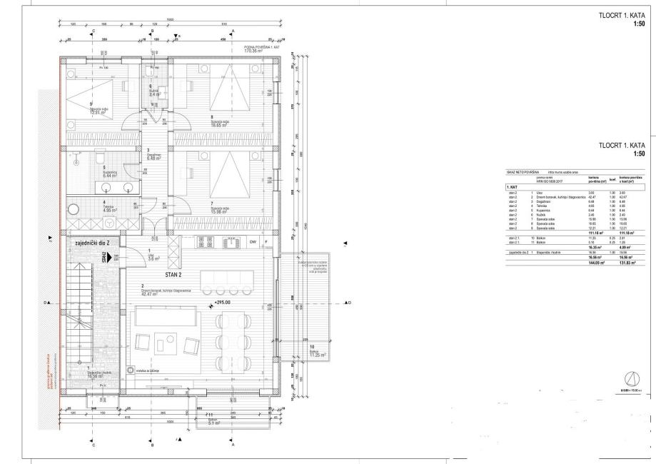 Stan se sastoji od predsoblja, kuhinje sa blagovaonom i dnevnog boravka, tri spavaće sobe , kupatila, gostinjskog toaleta, tehničke sobe i dvije terase.