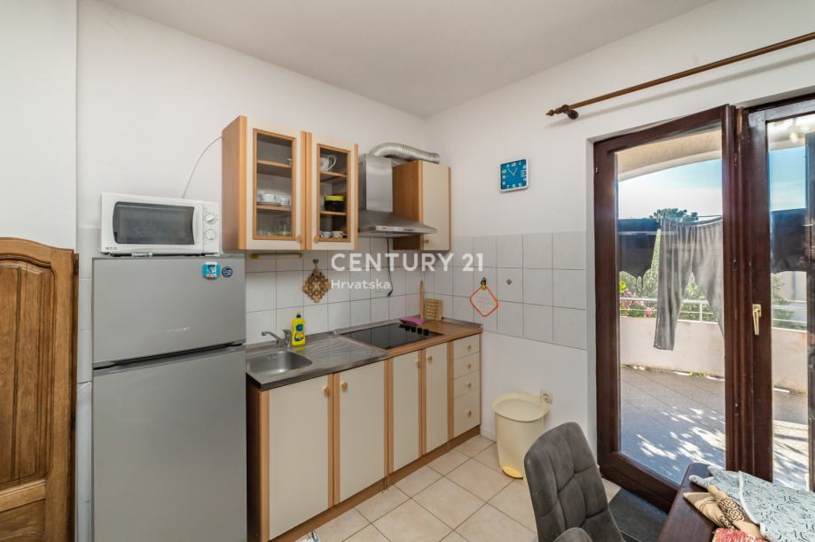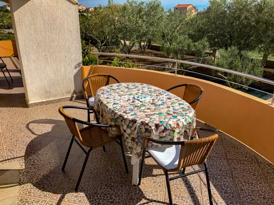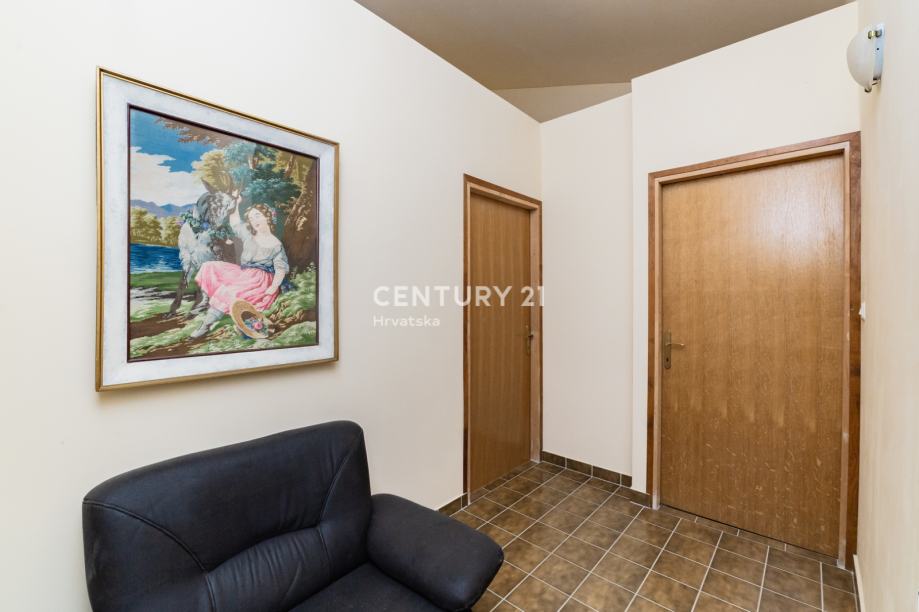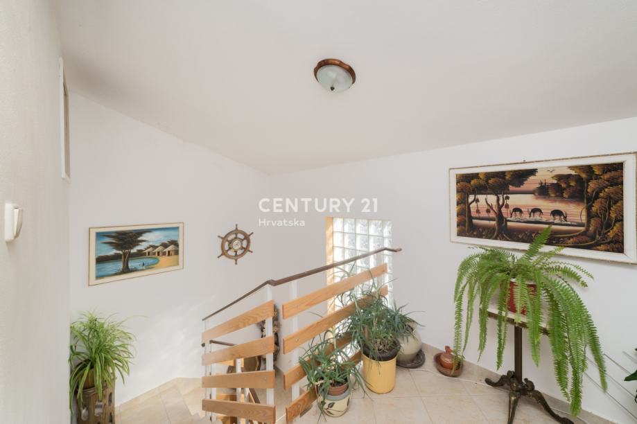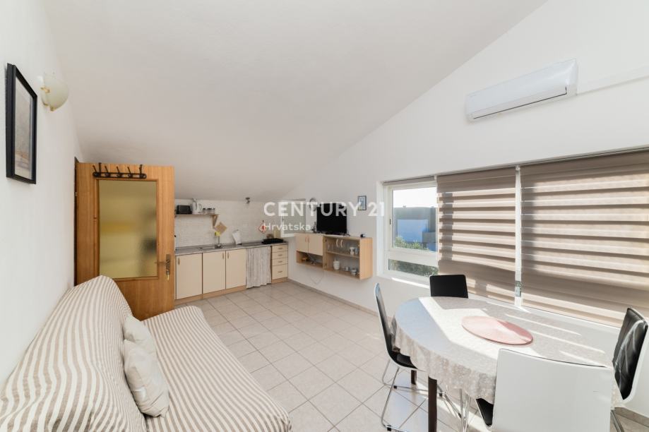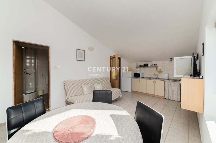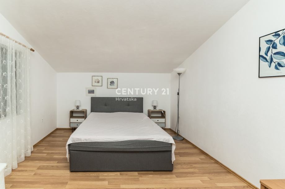 Na katu se nalazi uređeni apartman jednosobni: kuhinja sa blagovaonom, spavaćom sobom , kupaonicom i terasom. Dodatno na katu se nalaze još 2 nedovršena apartmana.