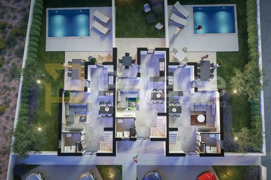 Stan se prostire na 120 m² i sastoji se od prizemlja i kata, s vlastitim privatnim ulazom. Sastoji se od tri spavaće sobe, kupaonice, loggie te natkrivene terase koja gleda prema vlastitom privatnom bazenu. Dodatna pogodnost su dva privatna parkirna mjesta, koja su uključena u cijenu. Dnevni boravak otvorenog koncepta s blagovaonicom i izlaskom do bazena.