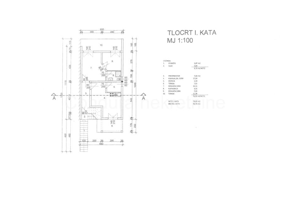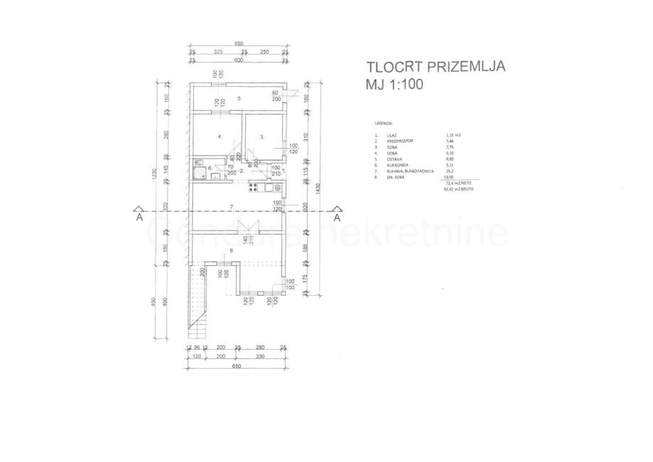 U prizemlju je jedan stan veličine 72,4 m2, koji se sastoji od ulaza, kupaonice, dvije spavaće sobe, kuhinje s blagovaonicom, dnevnog boravka te ostave.