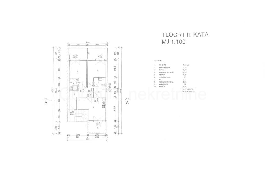 Na drugom katu se nalazi još jedan prostrani dvosoban stan (73,37 m2) koji se sastoji od ulaza, dvije spavaće sobe, kupaonice, WC-a, kuhinje, dnevnog boravka i dvije terase.