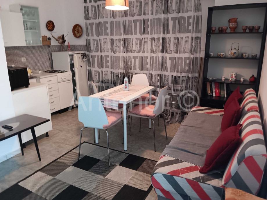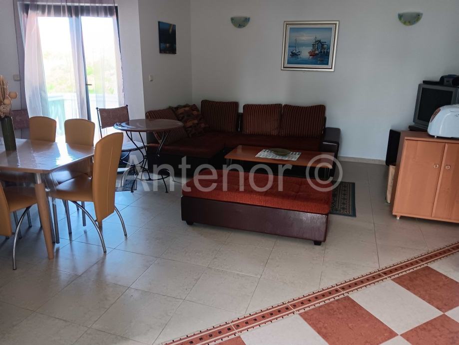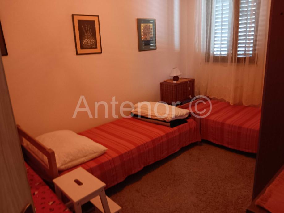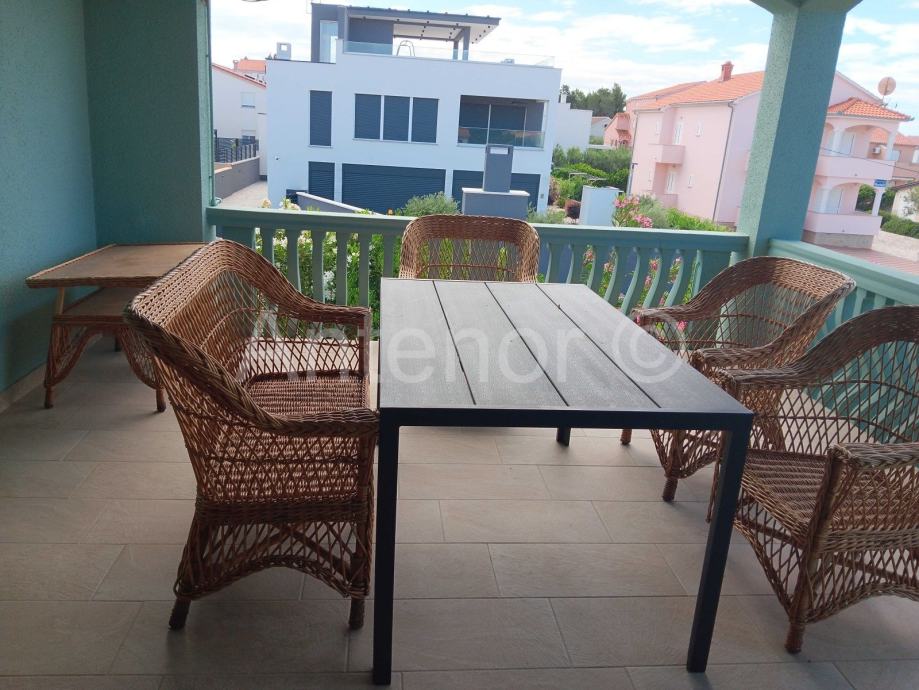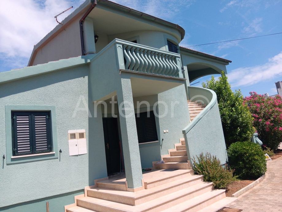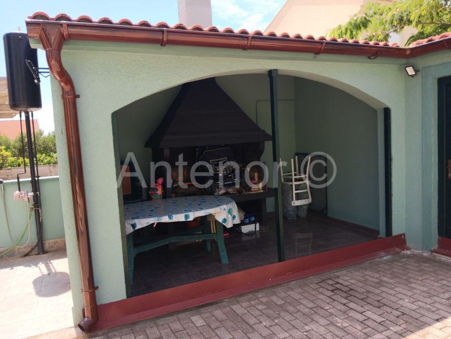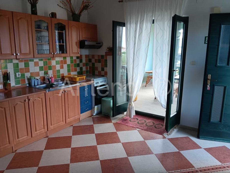 Vanjskim stubištem se dolazi na kat gdje se nalazi balkon, ulaz u stan, kuhinja, dnevni boravak, hodnik, dvije spavaće sobe i kupaonica. Iz dnevnog boravka se izalzi na prostranu terasu od 19,30 m2.