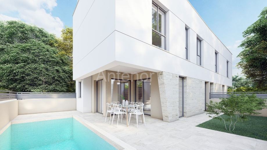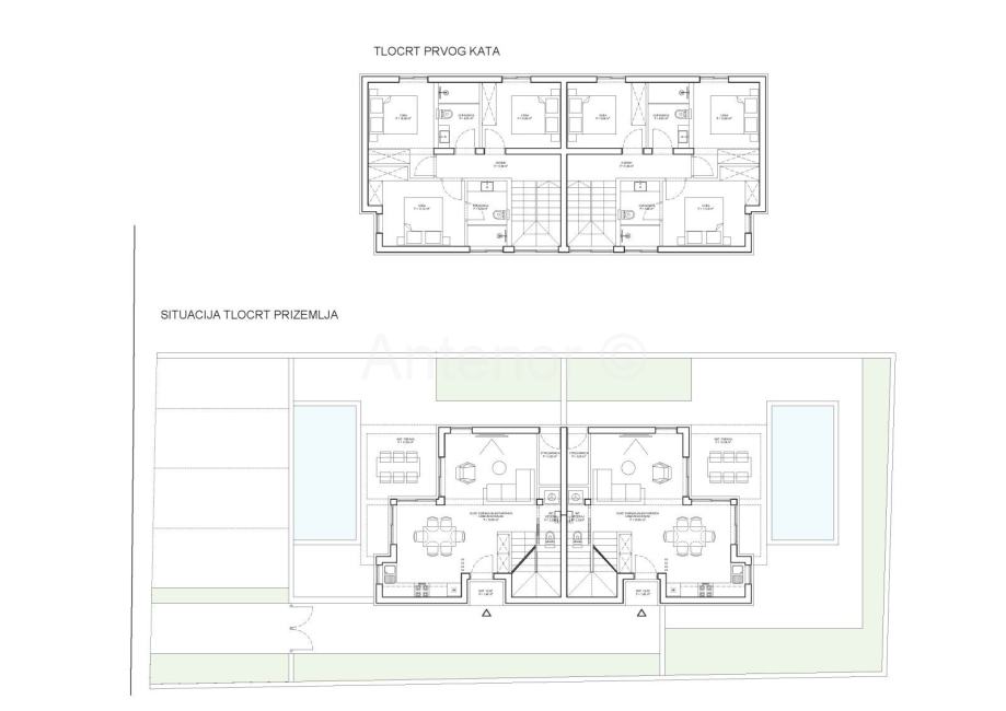 Stambena površina jedne stambene jedinice je 120m2 sa 50m2 okućnice. Kuća se sastoji od dvoje stambene jedinice od koje svaka jedinica ima tri spavaće sobe, tri kupaonice, vrta, bazena i dva parkirna mjesta.