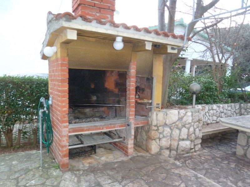 Kuća ima tri etaže, veliku garažu, vanjski roštilj i veliki kameni stol koji se nalazi iza kuće.