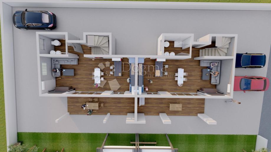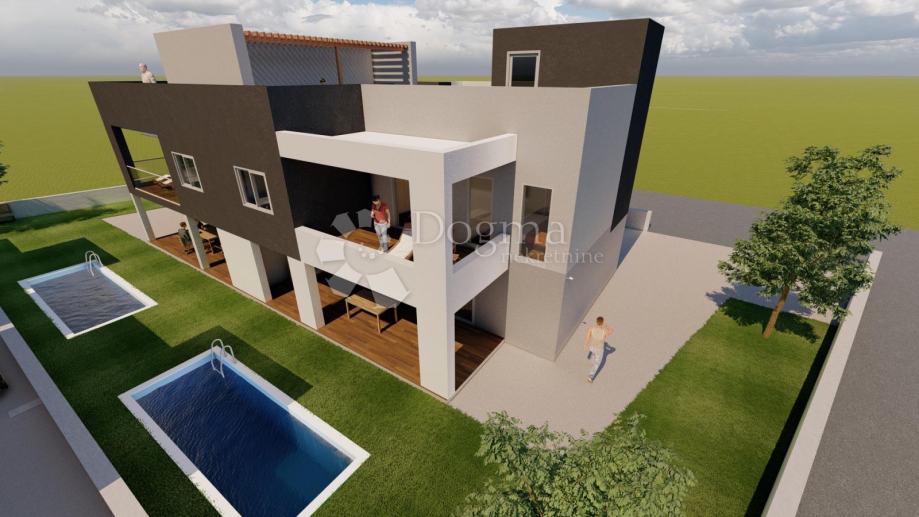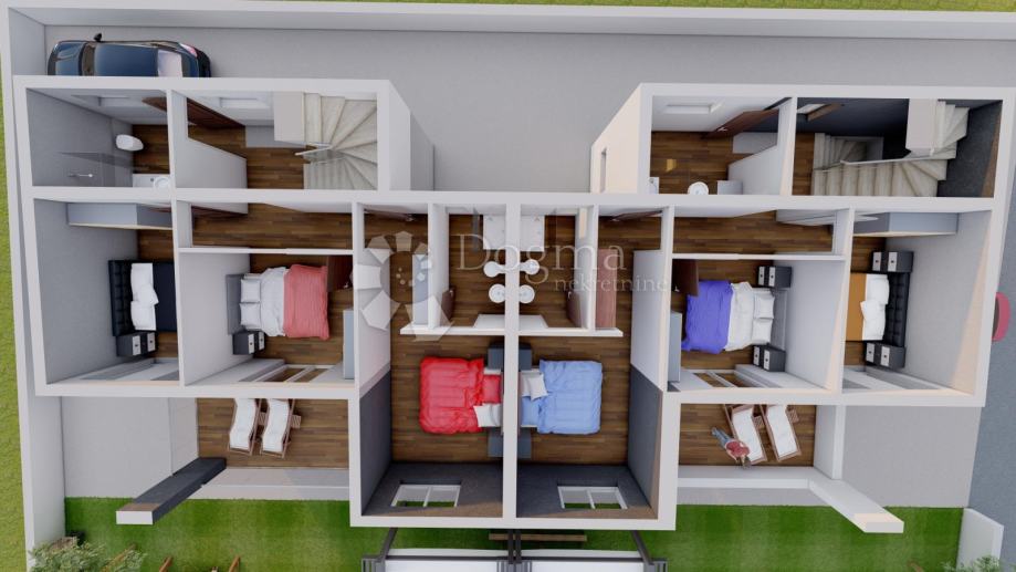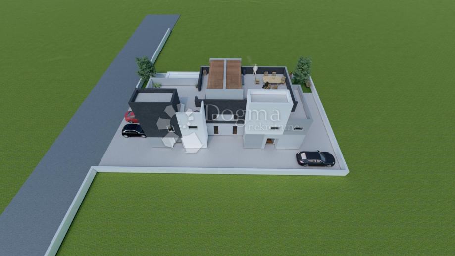 Svakoj stambenoj jedinici pripada vrt površine 220m2, bazen dimenzija 6m*3m, te 2 parkirna mjesta.