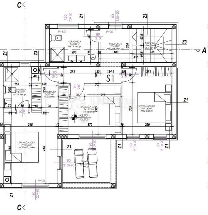 Stubište će biti popločano kamenom i bit će postavljena staklena ograda, podne obloge u sobama će biti laminirani parket, a u ostatku stana i na terasama keramičke pločice.