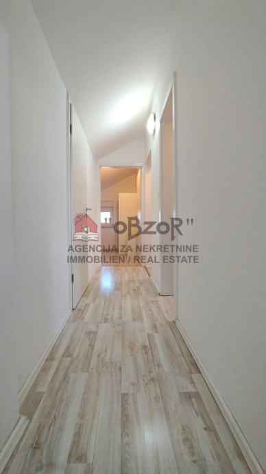 Prostori su funkcionalno raspoređeni, s dnevnim boravkom, kuhinjom i blagovaonicom koji čine otvorenu i svijetlu cjelinu. Prostrani dnevni boravak pruža obilje prirodnog svjetla i izravan pristup balkonu, s kojeg se proteže panoramski pogled na more. Kuhinja je funkcionalno integrirana u dnevni prostor, čime se postiže osjećaj otvorenosti i prozračnosti. Tri spavaće sobe nude dovoljno privatnosti i prostora za obitelj ili goste, dok su kupaonice opremljena osnovnim sadržajima. Grijanje je omogućeno putem struje, a ugrađena klima uređaj osigurava dodatnu udobnost tijekom svih godišnjih doba.