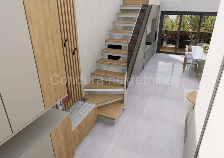 Prizemlje se sastoji od: ulaznog dijela, kupaonice, dnevnog boravka s kuhinjom i blagovaonicom. Iz dnevnog boravka staklene stijene vode na natkrivenu terasu, koja se dalje nastavlja na prostrani privatni vrt površine od oko 175 m2.