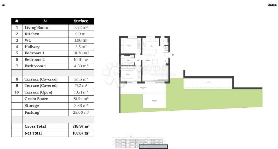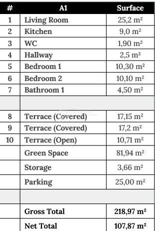Stan A1, prizemna vrtna oaza, savršeno utjelovljuje tu ideju. Na neto površini od 107,87 m² raspoređene su dvije spavaće sobe, kupaonica, dodatni WC, kuhinja i svijetli dnevni boravak. Posebnost ovog stana čine vanjski prostori: dvije natkrivene i jedna otvorena terasa (preko 45 m² ukupno), te privatni vrt od gotovo 82 m² – prava mala mediteranska pozornica za objedovanje pod borovima, dječju igru ili tihe večeri u društvu cvrčaka.